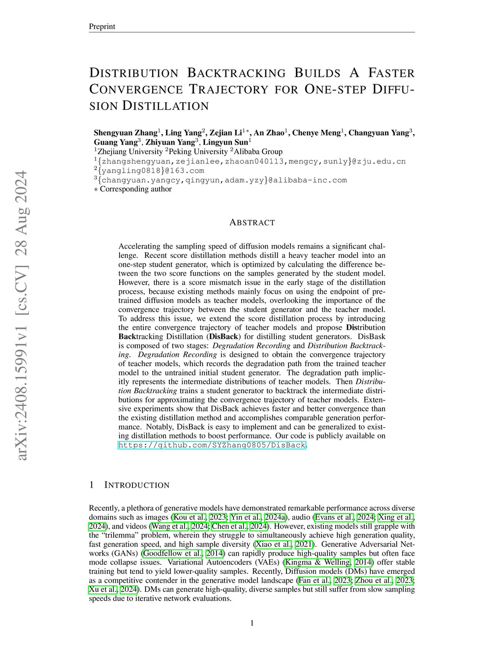 Accelerating the sampling speed of diffusion models remains a significant challenge. Recent score distillation methods distill a heavy teacher model into a student generator to achieve one-step generation, which is optimized by calculating the difference between the two score functions on the samples generated by the student model. However, there is a score mismatch issue in the early stage of the distillation process, because existing methods mainly focus on using the endpoint of pre-trained diffusion models as teacher models, overlooking the importance of the convergence trajectory between the student generator and the teacher model. To address this issue, we extend the score distillation process by introducing the entire convergence trajectory of teacher models and propose Distribution Backtracking Distillation (DisBack). DisBask is composed of two stages: Degradation Recording and Distribution Backtracking. Degradation Recording is designed to obtain the convergence trajectory of the teacher model, which records the degradation path from the trained teacher model to the untrained initial student generator. The degradation path implicitly represents the teacher model's intermediate distributions, and its reverse can be viewed as the convergence trajectory from the student generator to the teacher model. Then Distribution Backtracking trains a student generator to backtrack the intermediate distributions along the path to approximate the convergence trajectory of teacher models. Extensive experiments show that DisBack achieves faster and better convergence than the existing distillation method and accomplishes comparable generation performance, with FID score of 1.38 on ImageNet 64x64 dataset. Notably, DisBack is easy to implement and can be generalized to existing distillation methods to boost performance. Our code is publicly available onthis https URL.