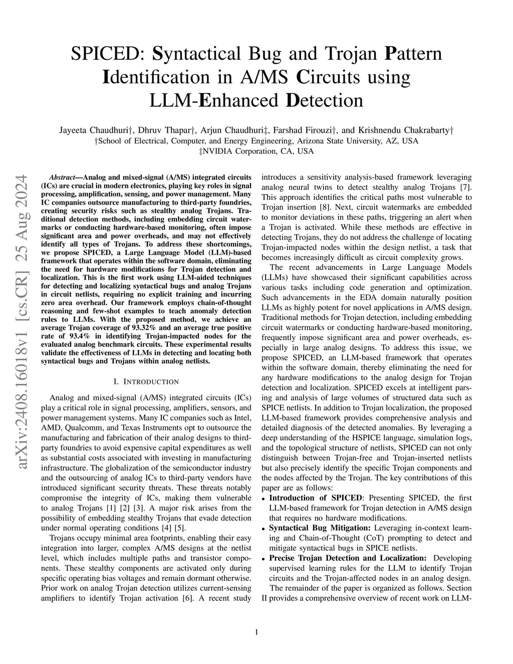 Analog and mixed-signal (A/MS) integrated circuits (ICs) are crucial in modern electronics, playing key roles in signal processing, amplification, sensing, and power management. Many IC companies outsource manufacturing to third-party foundries, creating security risks such as stealthy analog Trojans. Traditional detection methods, including embedding circuit watermarks or conducting hardware-based monitoring, often impose significant area and power overheads, and may not effectively identify all types of Trojans. To address these shortcomings, we propose SPICED, a Large Language Model (LLM)-based framework that operates within the software domain, eliminating the need for hardware modifications for Trojan detection and localization. This is the first work using LLM-aided techniques for detecting and localizing syntactical bugs and analog Trojans in circuit netlists, requiring no explicit training and incurring zero area overhead. Our framework employs chain-of-thought reasoning and few-shot examples to teach anomaly detection rules to LLMs. With the proposed method, we achieve an average Trojan coverage of 93.32% and an average true positive rate of 93.4% in identifying Trojan-impacted nodes for the evaluated analog benchmark circuits. These experimental results validate the effectiveness of LLMs in detecting and locating both syntactical bugs and Trojans within analog netlists.