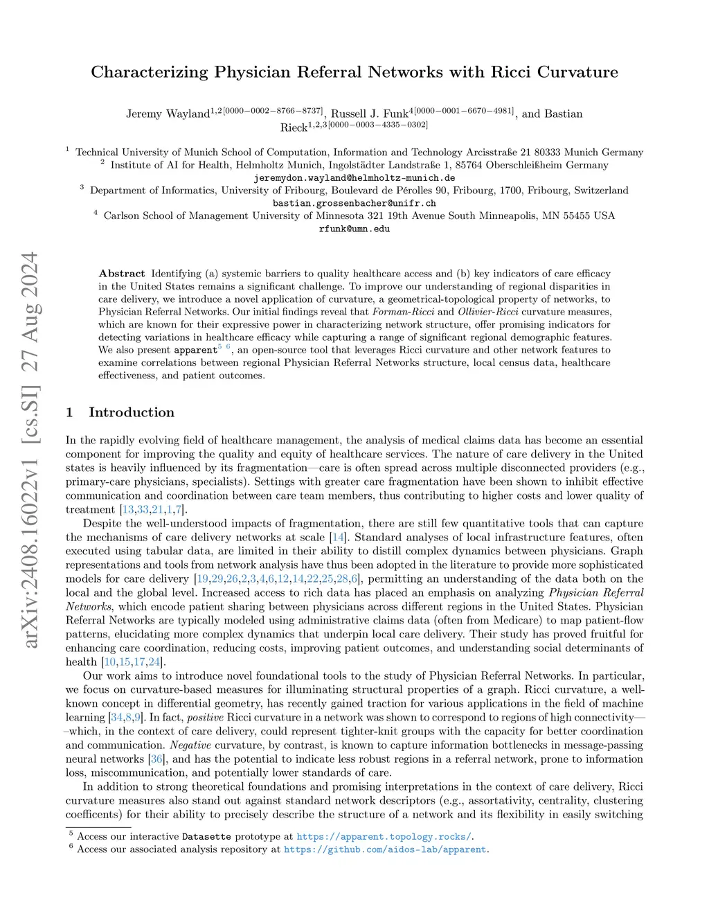 Identifying (a) systemic barriers to quality healthcare access and (b) key indicators of care efficacy in the United States remains a significant challenge. To improve our understanding of regional disparities in care delivery, we introduce a novel application of curvature, a geometrical-topological property of networks, to Physician Referral Networks. Our initial findings reveal that Forman-Ricci and Ollivier-Ricci curvature measures, which are known for their expressive power in characterizing network structure, offer promising indicators for detecting variations in healthcare efficacy while capturing a range of significant regional demographic features. We also present APPARENT, an open-source tool that leverages Ricci curvature and other network features to examine correlations between regional Physician Referral Networks structure, local census data, healthcare effectiveness, and patient outcomes.