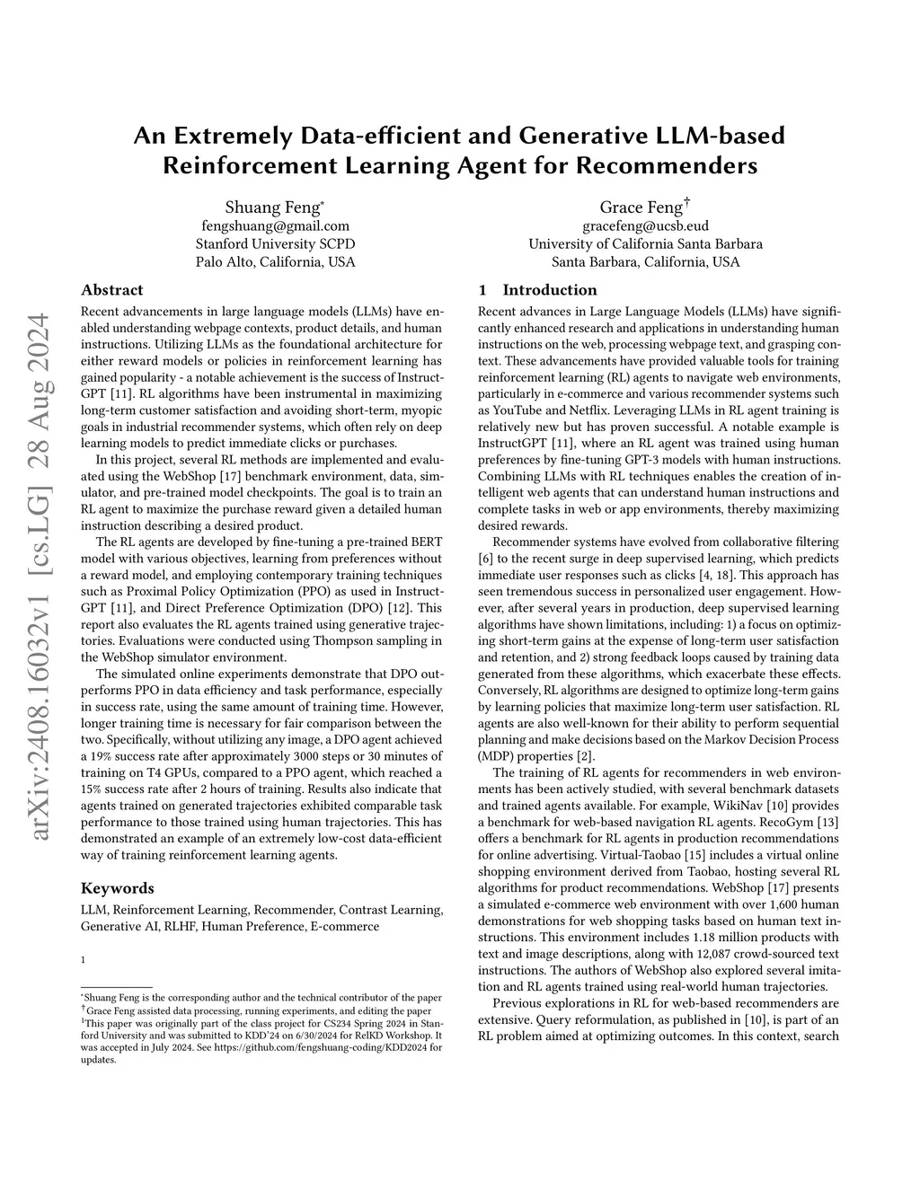 Recent advancements in large language models (LLMs) have enabled understanding webpage contexts, product details, and human instructions. Utilizing LLMs as the foundational architecture for either reward models or policies in reinforcement learning has gained popularity -- a notable achievement is the success of InstructGPT. RL algorithms have been instrumental in maximizing long-term customer satisfaction and avoiding short-term, myopic goals in industrial recommender systems, which often rely on deep learning models to predict immediate clicks or purchases. In this project, several RL methods are implemented and evaluated using the WebShop benchmark environment, data, simulator, and pre-trained model checkpoints. The goal is to train an RL agent to maximize the purchase reward given a detailed human instruction describing a desired product. The RL agents are developed by fine-tuning a pre-trained BERT model with various objectives, learning from preferences without a reward model, and employing contemporary training techniques such as Proximal Policy Optimization (PPO) as used in InstructGPT, and Direct Preference Optimization (DPO). This report also evaluates the RL agents trained using generative trajectories. Evaluations were conducted using Thompson sampling in the WebShop simulator environment. The simulated online experiments demonstrate that agents trained on generated trajectories exhibited comparable task performance to those trained using human trajectories. This has demonstrated an example of an extremely low-cost data-efficient way of training reinforcement learning agents. Also, with limited training time (<2hours), without utilizing any images, a DPO agent achieved a 19% success rate after approximately 3000 steps or 30 minutes of training on T4 GPUs, compared to a PPO agent, which reached a 15% success rate.
