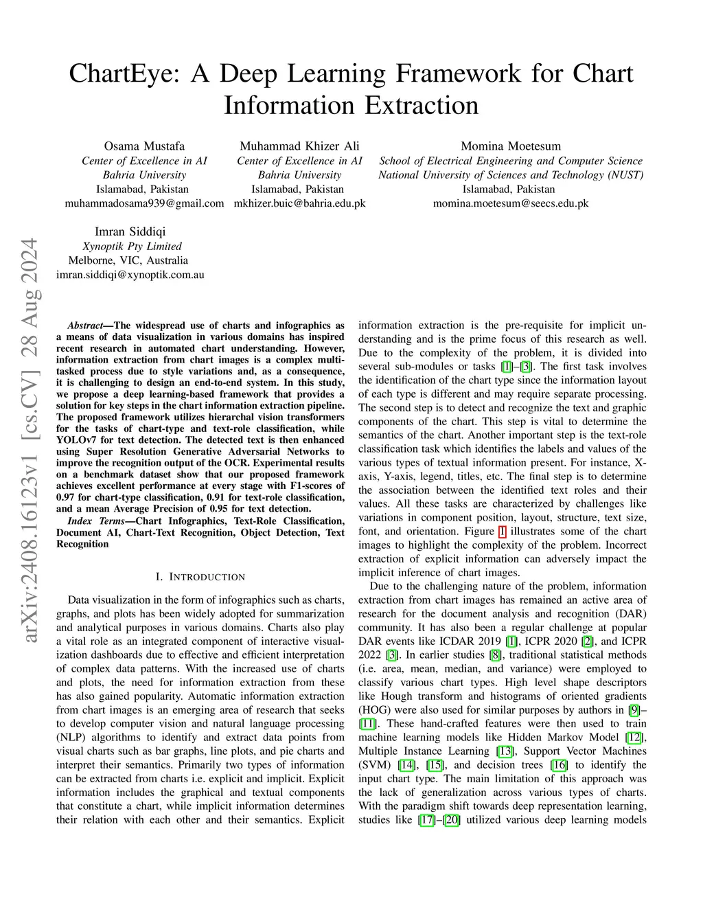 The widespread use of charts and infographics as a means of data visualization in various domains has inspired recent research in automated chart understanding. However, information extraction from chart images is a complex multitasked process due to style variations and, as a consequence, it is challenging to design an end-to-end system. In this study, we propose a deep learning-based framework that provides a solution for key steps in the chart information extraction pipeline. The proposed framework utilizes hierarchal vision transformers for the tasks of chart-type and text-role classification, while YOLOv7 for text detection. The detected text is then enhanced using Super Resolution Generative Adversarial Networks to improve the recognition output of the OCR. Experimental results on a benchmark dataset show that our proposed framework achieves excellent performance at every stage with F1-scores of 0.97 for chart-type classification, 0.91 for text-role classification, and a mean Average Precision of 0.95 for text detection.