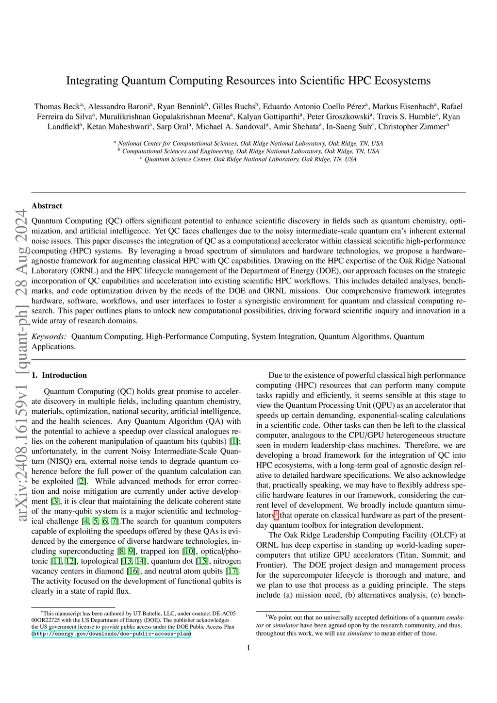 Quantum Computing (QC) offers significant potential to enhance scientific discovery in fields such as quantum chemistry, optimization, and artificial intelligence. Yet QC faces challenges due to the noisy intermediate-scale quantum era's inherent external noise issues. This paper discusses the integration of QC as a computational accelerator within classical scientific high-performance computing (HPC) systems. By leveraging a broad spectrum of simulators and hardware technologies, we propose a hardware-agnostic framework for augmenting classical HPC with QC capabilities. Drawing on the HPC expertise of the Oak Ridge National Laboratory (ORNL) and the HPC lifecycle management of the Department of Energy (DOE), our approach focuses on the strategic incorporation of QC capabilities and acceleration into existing scientific HPC workflows. This includes detailed analyses, benchmarks, and code optimization driven by the needs of the DOE and ORNL missions. Our comprehensive framework integrates hardware, software, workflows, and user interfaces to foster a synergistic environment for quantum and classical computing research. This paper outlines plans to unlock new computational possibilities, driving forward scientific inquiry and innovation in a wide array of research domains.