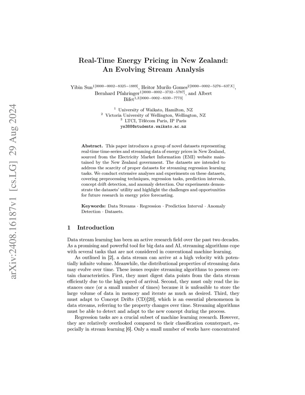 This paper introduces a group of novel datasets representing real-time time-series and streaming data of energy prices in New Zealand, sourced from the Electricity Market Information (EMI) website maintained by the New Zealand government. The datasets are intended to address the scarcity of proper datasets for streaming regression learning tasks. We conduct extensive analyses and experiments on these datasets, covering preprocessing techniques, regression tasks, prediction intervals, concept drift detection, and anomaly detection. Our experiments demonstrate the datasets' utility and highlight the challenges and opportunities for future research in energy price forecasting.