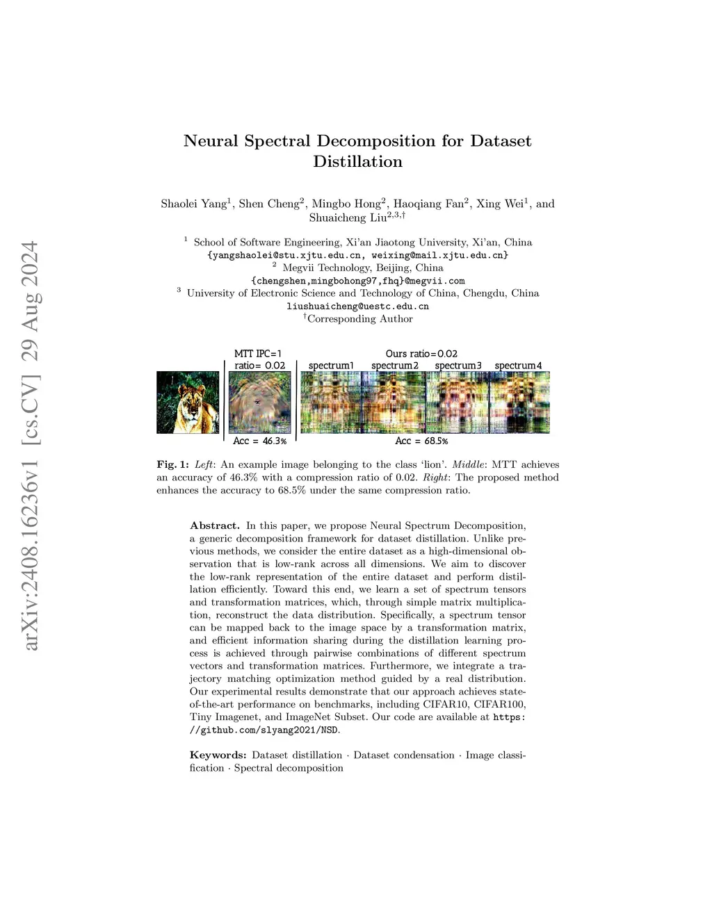 In this paper, we propose Neural Spectrum Decomposition, a generic decomposition framework for dataset distillation. Unlike previous methods, we consider the entire dataset as a high-dimensional observation that is low-rank across all dimensions. We aim to discover the low-rank representation of the entire dataset and perform distillation efficiently. Toward this end, we learn a set of spectrum tensors and transformation matrices, which, through simple matrix multiplication, reconstruct the data distribution. Specifically, a spectrum tensor can be mapped back to the image space by a transformation matrix, and efficient information sharing during the distillation learning process is achieved through pairwise combinations of different spectrum vectors and transformation matrices. Furthermore, we integrate a trajectory matching optimization method guided by a real distribution. Our experimental results demonstrate that our approach achieves state-of-the-art performance on benchmarks, including CIFAR10, CIFAR100, Tiny Imagenet, and ImageNet Subset. Our code are available at \url{https://github.com/slyang2021/NSD}.