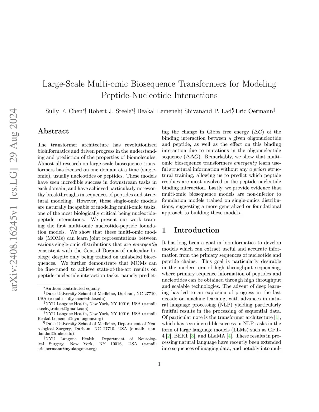 The transformer architecture has revolutionized bioinformatics and driven progress in the understanding and prediction of the properties of biomolecules. To date, most biosequence transformers have been trained on single-omic data-either proteins or nucleic acids and have seen incredible success in downstream tasks in each domain, with particularly noteworthy breakthroughs in protein structural modeling. However, single-omic pre-training limits the ability of these models to capture cross-modal interactions. Here we present OmniBioTE, the largest open-source multi-omic model trained on over 250 billion tokens of mixed protein and nucleic acid data. We show that despite only being trained on unlabeled sequence data, OmniBioTE learns joint representations mapping genes to their corresponding protein sequences. We further demonstrate that OmbiBioTE achieves state-of-the-art results predicting the change in Gibbs free energy ({\Delta}G) of the binding interaction between a given nucleic acid and protein. Remarkably, we show that multi-omic biosequence transformers emergently learn useful structural information without any a priori structural training, allowing us to predict which protein residues are most involved in the protein-nucleic acid binding interaction. Lastly, compared to single-omic controls trained with identical compute, OmniBioTE demonstrates superior performance-per-FLOP across both multi-omic and single-omic benchmarks, highlighting the power of a unified modeling approach for biological sequences.