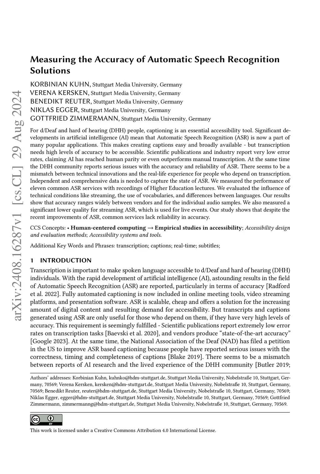 For d/Deaf and hard of hearing (DHH) people, captioning is an essential accessibility tool. Significant developments in artificial intelligence (AI) mean that Automatic Speech Recognition (ASR) is now a part of many popular applications. This makes creating captions easy and broadly available - but transcription needs high levels of accuracy to be accessible. Scientific publications and industry report very low error rates, claiming AI has reached human parity or even outperforms manual transcription. At the same time the DHH community reports serious issues with the accuracy and reliability of ASR. There seems to be a mismatch between technical innovations and the real-life experience for people who depend on transcription. Independent and comprehensive data is needed to capture the state of ASR. We measured the performance of eleven common ASR services with recordings of Higher Education lectures. We evaluated the influence of technical conditions like streaming, the use of vocabularies, and differences between languages. Our results show that accuracy ranges widely between vendors and for the individual audio samples. We also measured a significant lower quality for streaming ASR, which is used for live events. Our study shows that despite the recent improvements of ASR, common services lack reliability in accuracy.