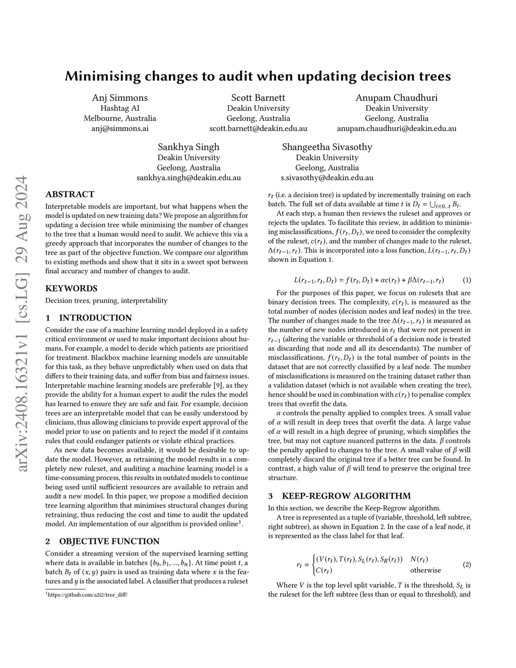 Interpretable models are important, but what happens when the model is updated on new training data? We propose an algorithm for updating a decision tree while minimising the number of changes to the tree that a human would need to audit. We achieve this via a greedy approach that incorporates the number of changes to the tree as part of the objective function. We compare our algorithm to existing methods and show that it sits in a sweet spot between final accuracy and number of changes to audit.