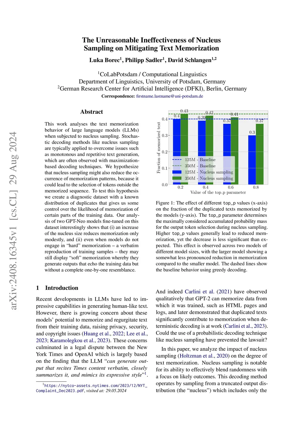 This work analyses the text memorization behavior of large language models (LLMs) when subjected to nucleus sampling. Stochastic decoding methods like nucleus sampling are typically applied to overcome issues such as monotonous and repetitive text generation, which are often observed with maximization-based decoding techniques. We hypothesize that nucleus sampling might also reduce the occurrence of memorization patterns, because it could lead to the selection of tokens outside the memorized sequence. To test this hypothesis we create a diagnostic dataset with a known distribution of duplicates that gives us some control over the likelihood of memorization of certain parts of the training data. Our analysis of two GPT-Neo models fine-tuned on this dataset interestingly shows that (i) an increase of the nucleus size reduces memorization only modestly, and (ii) even when models do not engage in "hard" memorization -- a verbatim reproduction of training samples -- they may still display "soft" memorization whereby they generate outputs that echo the training data but without a complete one-by-one resemblance.