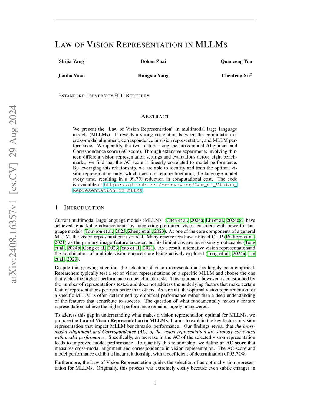 We present the "Law of Vision Representation" in multimodal large language models (MLLMs). It reveals a strong correlation between the combination of cross-modal alignment, correspondence in vision representation, and MLLM performance. We quantify the two factors using the cross-modal Alignment and Correspondence score (AC score). Through extensive experiments involving thirteen different vision representation settings and evaluations across eight benchmarks, we find that the AC score is linearly correlated to model performance. By leveraging this relationship, we are able to identify and train the optimal vision representation only, which does not require finetuning the language model every time, resulting in a 99.7% reduction in computational cost.