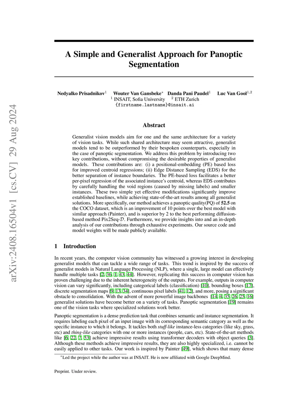 Panoptic segmentation is an important computer vision task, where the current state-of-the-art solutions require specialized components to perform well. We propose a simple generalist framework based on a deep encoder - shallow decoder architecture with per-pixel prediction. Essentially fine-tuning a massively pretrained image model with minimal additional components. Naively this method does not yield good results. We show that this is due to imbalance during training and propose a novel method for reducing it - centroid regression in the space of spectral positional embeddings. Our method achieves panoptic quality (PQ) of 55.1 on the challenging MS-COCO dataset, state-of-the-art performance among generalist methods.
