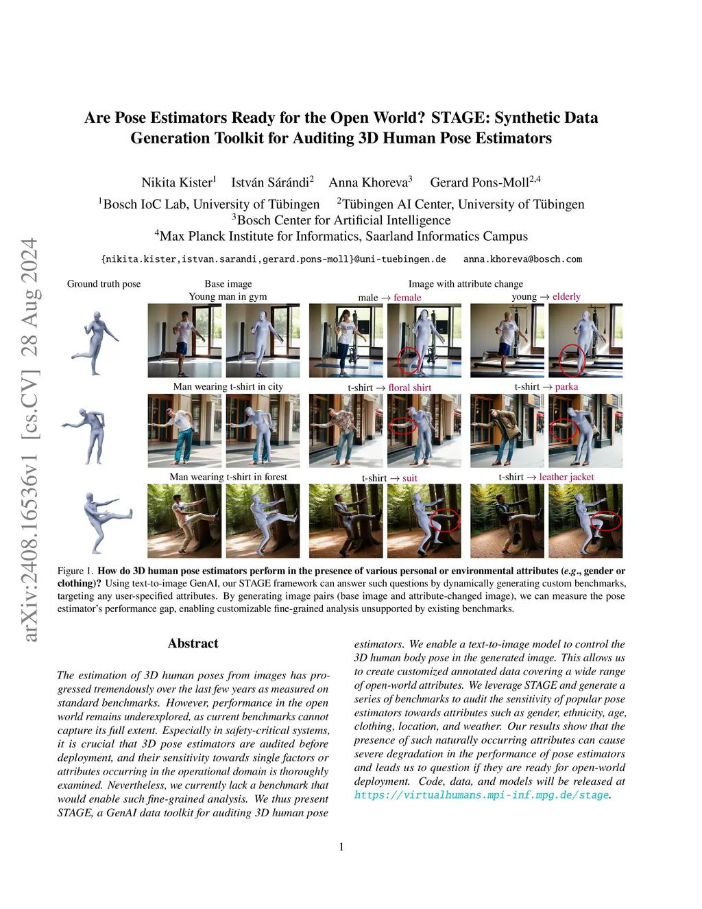 For safety-critical applications, it is crucial to audit 3D human pose estimators before deployment. Will the system break down if the weather or the clothing changes? Is it robust regarding gender and age? To answer these questions and more, we need controlled studies with images that differ in a single attribute, but real benchmarks cannot provide such pairs. We thus present STAGE, a GenAI data toolkit for auditing 3D human pose estimators. For STAGE, we develop the first GenAI image creator with accurate 3D pose control and propose a novel evaluation strategy to isolate and quantify the effects of single factors such as gender, ethnicity, age, clothing, location, and weather. Enabled by STAGE, we generate a series of benchmarks to audit, for the first time, the sensitivity of popular pose estimators towards such factors. Our results show that natural variations can severely degrade pose estimator performance, raising doubts about their readiness for open-world deployment. We aim to highlight these robustness issues and establish STAGE as a benchmark to quantify them.