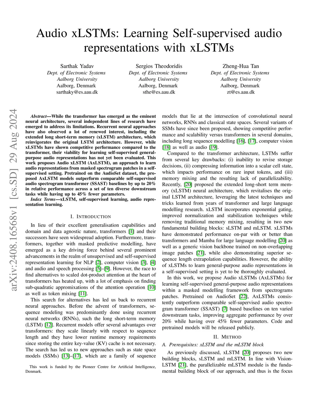 While the transformer has emerged as the eminent neural architecture, several independent lines of research have emerged to address its limitations. Recurrent neural approaches have observed a lot of renewed interest, including the extended long short-term memory (xLSTM) architecture, which reinvigorates the original LSTM. However, while xLSTMs have shown competitive performance compared to the transformer, their viability for learning self-supervised general-purpose audio representations has not been evaluated. This work proposes Audio xLSTM (AxLSTM), an approach for learning audio representations from masked spectrogram patches in a self-supervised setting. Pretrained on the AudioSet dataset, the proposed AxLSTM models outperform comparable self-supervised audio spectrogram transformer (SSAST) baselines by up to 25% in relative performance across a set of ten diverse downstream tasks while having up to 45% fewer parameters.