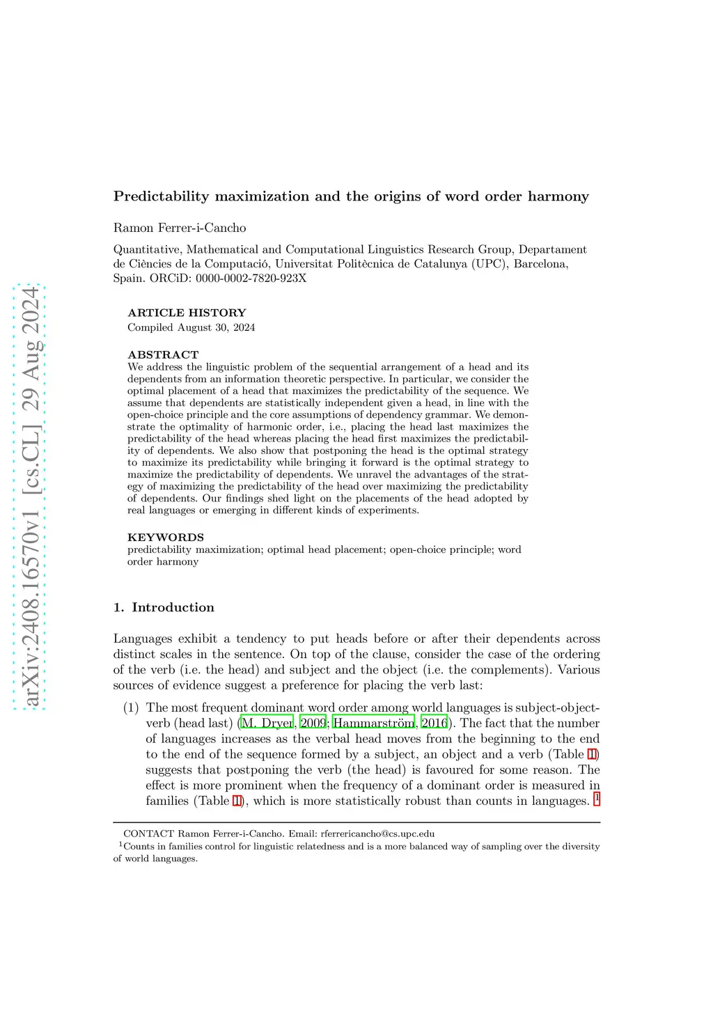We address the linguistic problem of the sequential arrangement of a head and its dependents from an information theoretic perspective. In particular, we consider the optimal placement of a head that maximizes the predictability of the sequence. We assume that dependents are statistically independent given a head, in line with the open-choice principle and the core assumptions of dependency grammar. We demonstrate the optimality of harmonic order, i.e., placing the head last maximizes the predictability of the head whereas placing the head first maximizes the predictability of dependents. We also show that postponing the head is the optimal strategy to maximize its predictability while bringing it forward is the optimal strategy to maximize the predictability of dependents. We unravel the advantages of the strategy of maximizing the predictability of the head over maximizing the predictability of dependents. Our findings shed light on the placements of the head adopted by real languages or emerging in different kinds of experiments.