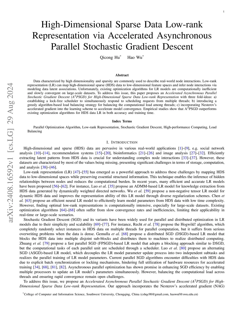 Data characterized by high dimensionality and sparsity are commonly used to describe real-world node interactions. Low-rank representation (LR) can map high-dimensional sparse (HDS) data to low-dimensional feature spaces and infer node interactions via modeling data latent associations. Unfortunately, existing optimization algorithms for LR models are computationally inefficient and slowly convergent on large-scale datasets. To address this issue, this paper proposes an Accelerated Asynchronous Parallel Stochastic Gradient Descent A2PSGD for High-Dimensional Sparse Data Low-rank Representation with three fold-ideas: a) establishing a lock-free scheduler to simultaneously respond to scheduling requests from multiple threads; b) introducing a greedy algorithm-based load balancing strategy for balancing the computational load among threads; c) incorporating Nesterov's accelerated gradient into the learning scheme to accelerate model convergence. Empirical studies show that A2PSGD outperforms existing optimization algorithms for HDS data LR in both accuracy and training time.