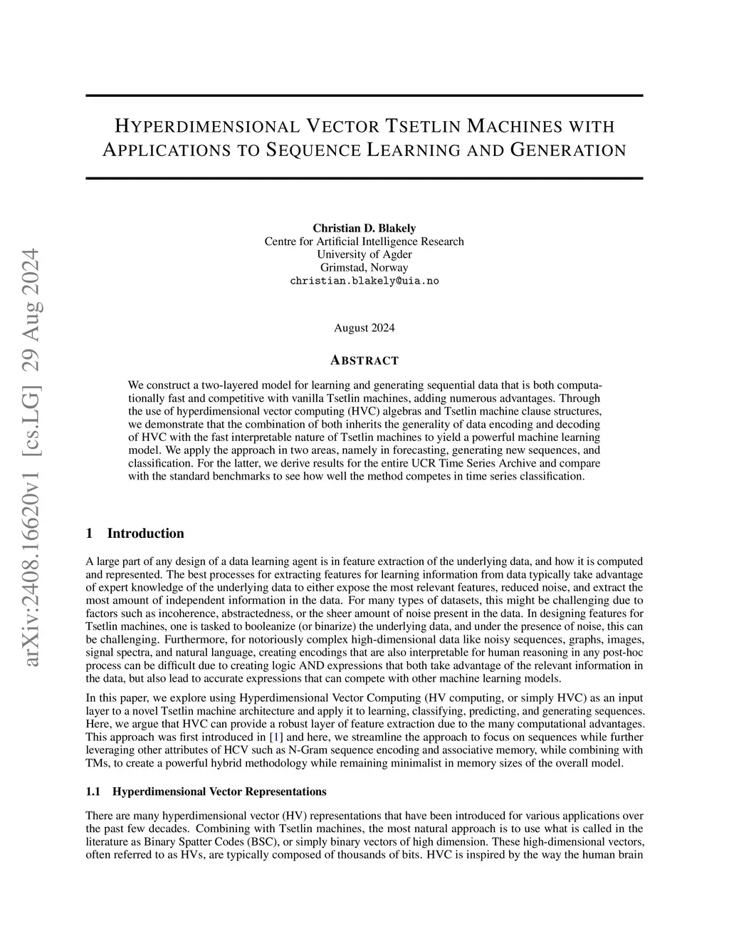 We construct a two-layered model for learning and generating sequential data that is both computationally fast and competitive with vanilla Tsetlin machines, adding numerous advantages. Through the use of hyperdimensional vector computing (HVC) algebras and Tsetlin machine clause structures, we demonstrate that the combination of both inherits the generality of data encoding and decoding of HVC with the fast interpretable nature of Tsetlin machines to yield a powerful machine learning model. We apply the approach in two areas, namely in forecasting, generating new sequences, and classification. For the latter, we derive results for the entire UCR Time Series Archive and compare with the standard benchmarks to see how well the method competes in time series classification.