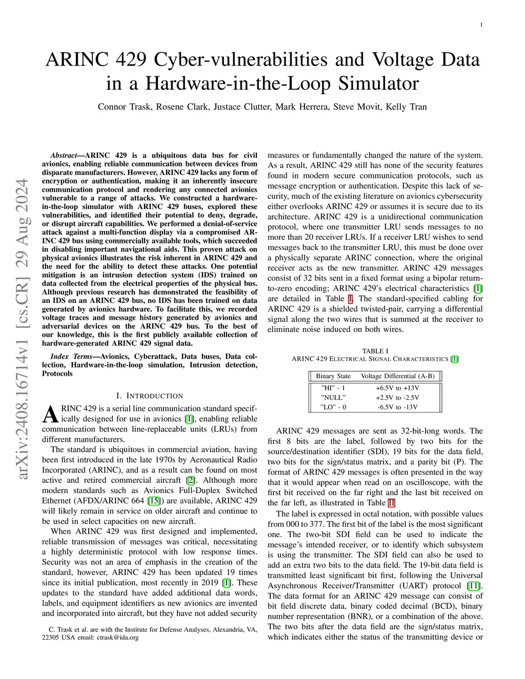 ARINC 429 Cyber-vulnerabilities and Voltage Data in a