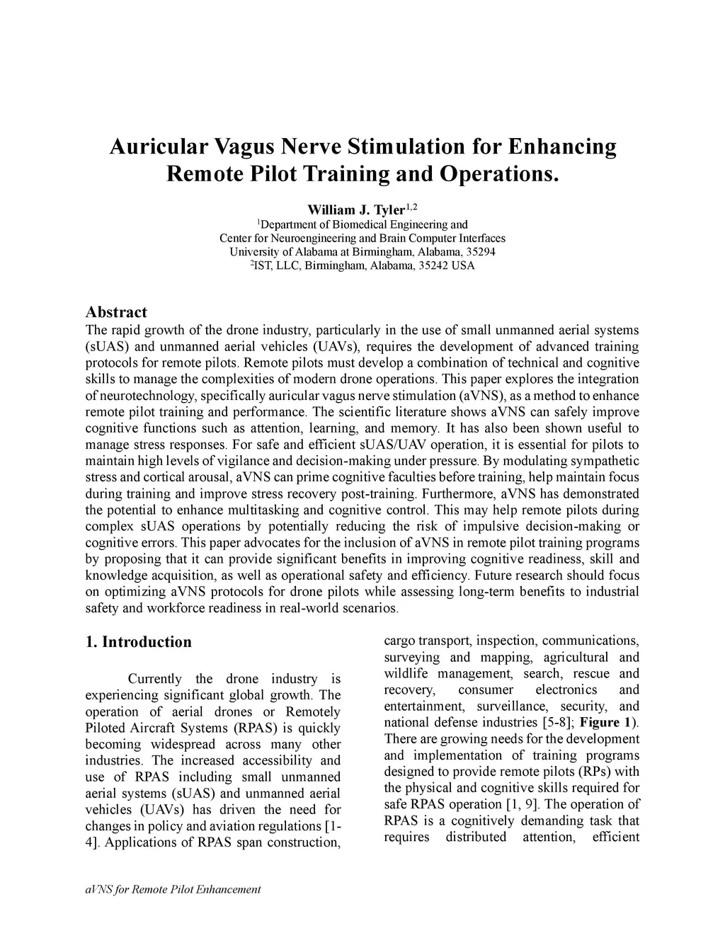 The rapid growth of the drone industry, particularly in the use of small unmanned aerial systems (sUAS) and unmanned aerial vehicles (UAVs), requires the development of advanced training protocols for remote pilots. Remote pilots must develop a combination of technical and cognitive skills to manage the complexities of modern drone operations. This paper explores the integration of neurotechnology, specifically auricular vagus nerve stimulation (aVNS), as a method to enhance remote pilot training and performance. The scientific literature shows aVNS can safely improve cognitive functions such as attention, learning, and memory. It has also been shown useful to manage stress responses. For safe and efficient sUAS/UAV operation, it is essential for pilots to maintain high levels of vigilance and decision-making under pressure. By modulating sympathetic stress and cortical arousal, aVNS can prime cognitive faculties before training, help maintain focus during training and improve stress recovery post-training. Furthermore, aVNS has demonstrated the potential to enhance multitasking and cognitive control. This may help remote pilots during complex sUAS operations by potentially reducing the risk of impulsive decision-making or cognitive errors. This paper advocates for the inclusion of aVNS in remote pilot training programs by proposing that it can provide significant benefits in improving cognitive readiness, skill and knowledge acquisition, as well as operational safety and efficiency. Future research should focus on optimizing aVNS protocols for drone pilots while assessing long-term benefits to industrial safety and workforce readiness in real-world scenarios.