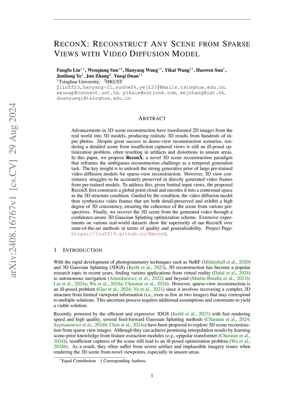 Advancements in 3D scene reconstruction have transformed 2D images from the real world into 3D models, producing realistic 3D results from hundreds of input photos. Despite great success in dense-view reconstruction scenarios, rendering a detailed scene from insufficient captured views is still an ill-posed optimization problem, often resulting in artifacts and distortions in unseen areas. In this paper, we propose ReconX, a novel 3D scene reconstruction paradigm that reframes the ambiguous reconstruction challenge as a temporal generation task. The key insight is to unleash the strong generative prior of large pre-trained video diffusion models for sparse-view reconstruction. However, 3D view consistency struggles to be accurately preserved in directly generated video frames from pre-trained models. To address this, given limited input views, the proposed ReconX first constructs a global point cloud and encodes it into a contextual space as the 3D structure condition. Guided by the condition, the video diffusion model then synthesizes video frames that are both detail-preserved and exhibit a high degree of 3D consistency, ensuring the coherence of the scene from various perspectives. Finally, we recover the 3D scene from the generated video through a confidence-aware 3D Gaussian Splatting optimization scheme. Extensive experiments on various real-world datasets show the superiority of our ReconX over state-of-the-art methods in terms of quality and generalizability.