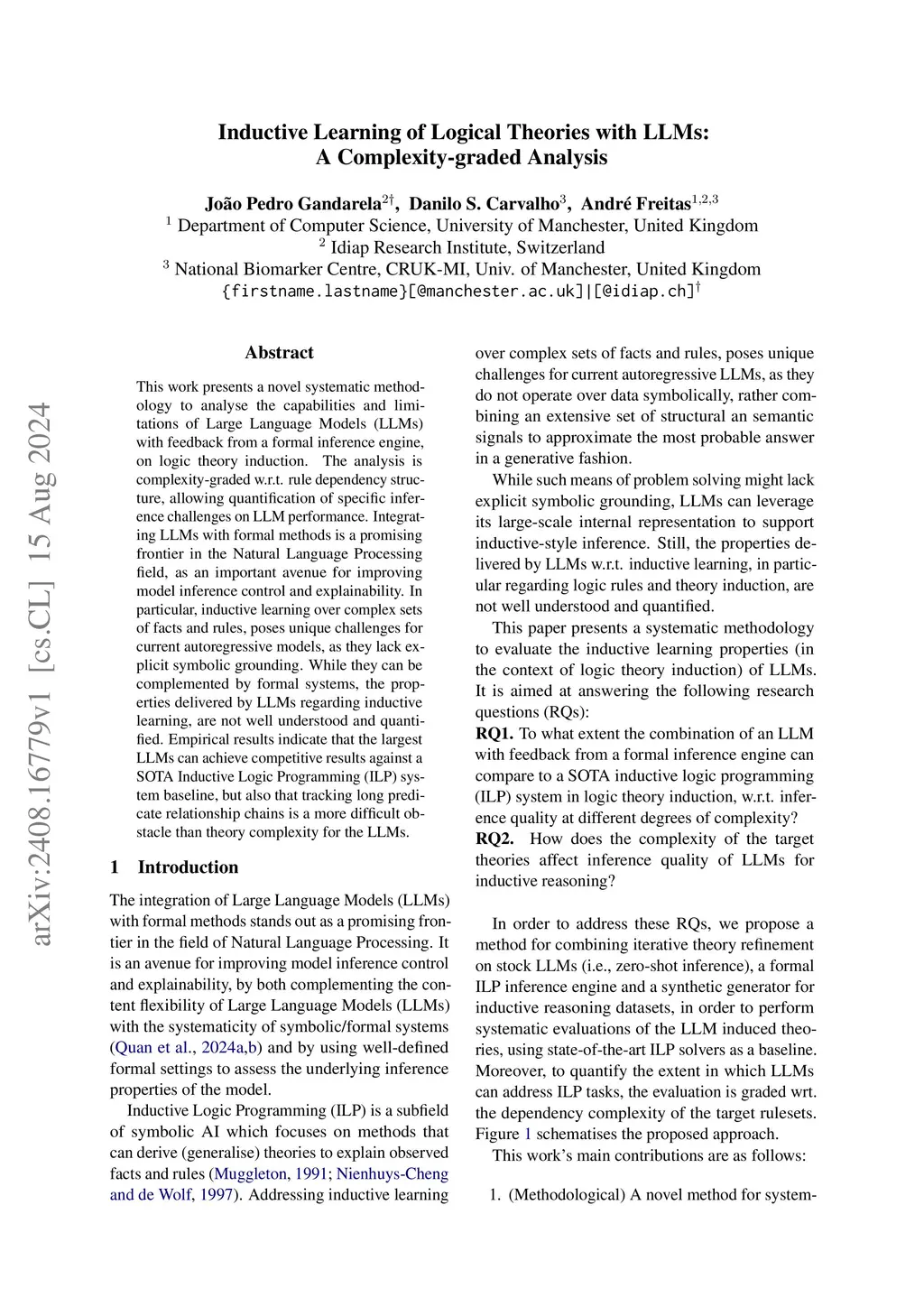 This work presents a novel systematic methodology to analyse the capabilities and limitations of Large Language Models (LLMs) with feedback from a formal inference engine, on logic theory induction. The analysis is complexity-graded w.r.t. rule dependency structure, allowing quantification of specific inference challenges on LLM performance. Integrating LLMs with formal methods is a promising frontier in the Natural Language Processing field, as an important avenue for improving model inference control and explainability. In particular, inductive learning over complex sets of facts and rules, poses unique challenges for current autoregressive models, as they lack explicit symbolic grounding. While they can be complemented by formal systems, the properties delivered by LLMs regarding inductive learning, are not well understood and quantified. Empirical results indicate that the largest LLMs can achieve competitive results against a SOTA Inductive Logic Programming (ILP) system baseline, but also that tracking long predicate relationship chains is a more difficult obstacle than theory complexity for LLMs.