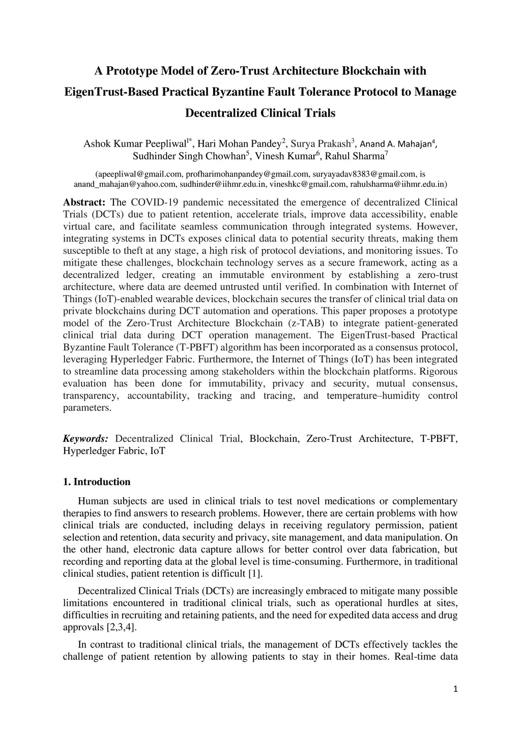 The COVID-19 pandemic necessitated the emergence of decentralized Clinical Trials (DCTs) due to patient retention, accelerate trials, improve data accessibility, enable virtual care, and facilitate seamless communication through integrated systems. However, integrating systems in DCTs exposes clinical data to potential security threats, making them susceptible to theft at any stage, a high risk of protocol deviations, and monitoring issues. To mitigate these challenges, blockchain technology serves as a secure framework, acting as a decentralized ledger, creating an immutable environment by establishing a zero-trust architecture, where data are deemed untrusted until verified. In combination with Internet of Things (IoT)-enabled wearable devices, blockchain secures the transfer of clinical trial data on private blockchains during DCT automation and operations. This paper proposes a prototype model of the Zero-Trust Architecture Blockchain (z-TAB) to integrate patient-generated clinical trial data during DCT operation management. The EigenTrust-based Practical Byzantine Fault Tolerance (T-PBFT) algorithm has been incorporated as a consensus protocol, leveraging Hyperledger Fabric. Furthermore, the Internet of Things (IoT) has been integrated to streamline data processing among stakeholders within the blockchain platforms. Rigorous evaluation has been done to evaluate the quality of the system.