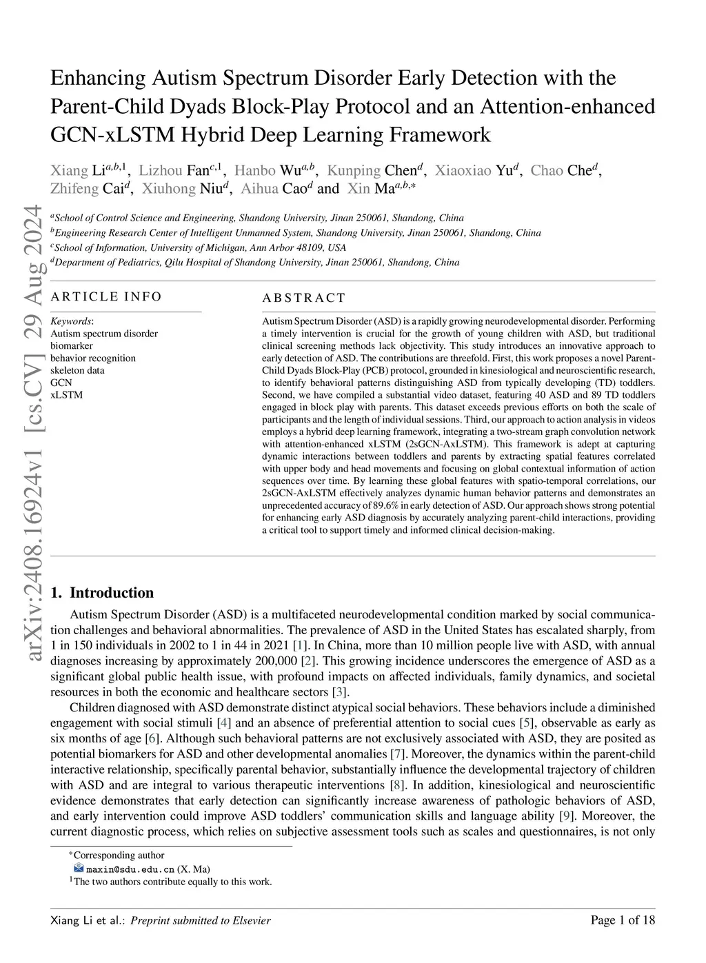 Autism Spectrum Disorder (ASD) is a rapidly growing neurodevelopmental disorder. Performing a timely intervention is crucial for the growth of young children with ASD, but traditional clinical screening methods lack objectivity. This study introduces an innovative approach to early detection of ASD. The contributions are threefold. First, this work proposes a novel Parent-Child Dyads Block-Play (PCB) protocol, grounded in kinesiological and neuroscientific research, to identify behavioral patterns distinguishing ASD from typically developing (TD) toddlers. Second, we have compiled a substantial video dataset, featuring 40 ASD and 89 TD toddlers engaged in block play with parents. This dataset exceeds previous efforts on both the scale of participants and the length of individual sessions. Third, our approach to action analysis in videos employs a hybrid deep learning framework, integrating a two-stream graph convolution network with attention-enhanced xLSTM (2sGCN-AxLSTM). This framework is adept at capturing dynamic interactions between toddlers and parents by extracting spatial features correlated with upper body and head movements and focusing on global contextual information of action sequences over time. By learning these global features with spatio-temporal correlations, our 2sGCN-AxLSTM effectively analyzes dynamic human behavior patterns and demonstrates an unprecedented accuracy of 89.6\% in early detection of ASD. Our approach shows strong potential for enhancing early ASD diagnosis by accurately analyzing parent-child interactions, providing a critical tool to support timely and informed clinical decision-making.