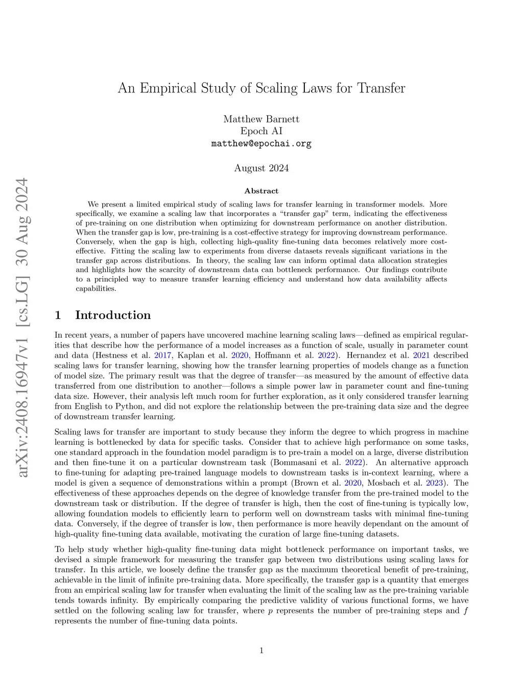 We present a limited empirical study of scaling laws for transfer learning in transformer models. More specifically, we examine a scaling law that incorporates a "transfer gap" term, indicating the effectiveness of pre-training on one distribution when optimizing for downstream performance on another distribution. When the transfer gap is low, pre-training is a cost-effective strategy for improving downstream performance. Conversely, when the gap is high, collecting high-quality fine-tuning data becomes relatively more cost effective. Fitting the scaling law to experiments from diverse datasets reveals significant variations in the transfer gap across distributions. In theory, the scaling law can inform optimal data allocation strategies and highlights how the scarcity of downstream data can bottleneck performance. Our findings contribute to a principled way to measure transfer learning efficiency and understand how data availability affects capabilities.