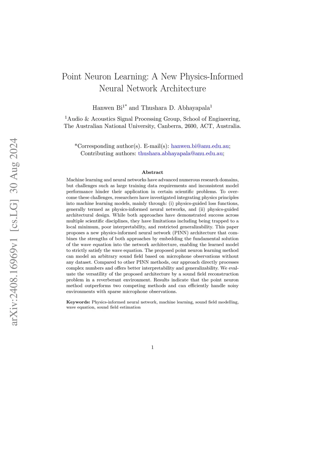 Machine learning and neural networks have advanced numerous research domains, but challenges such as large training data requirements and inconsistent model performance hinder their application in certain scientific problems. To overcome these challenges, researchers have investigated integrating physics principles into machine learning models, mainly through: (i) physics-guided loss functions, generally termed as physics-informed neural networks, and (ii) physics-guided architectural design. While both approaches have demonstrated success across multiple scientific disciplines, they have limitations including being trapped to a local minimum, poor interpretability, and restricted generalizability. This paper proposes a new physics-informed neural network (PINN) architecture that combines the strengths of both approaches by embedding the fundamental solution of the wave equation into the network architecture, enabling the learned model to strictly satisfy the wave equation. The proposed point neuron learning method can model an arbitrary sound field based on microphone observations without any dataset. Compared to other PINN methods, our approach directly processes complex numbers and offers better interpretability and generalizability. We evaluate the versatility of the proposed architecture by a sound field reconstruction problem in a reverberant environment. Results indicate that the point neuron method outperforms two competing methods and can efficiently handle noisy environments with sparse microphone observations.