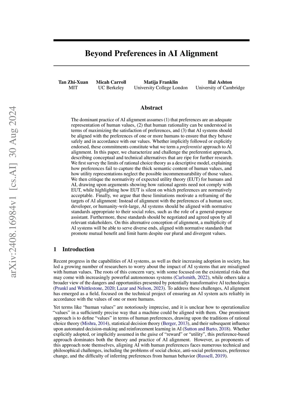 The dominant practice of AI alignment assumes (1) that preferences are an adequate representation of human values, (2) that human rationality can be understood in terms of maximizing the satisfaction of preferences, and (3) that AI systems should be aligned with the preferences of one or more humans to ensure that they behave safely and in accordance with our values. Whether implicitly followed or explicitly endorsed, these commitments constitute what we term a preferentist approach to AI alignment. In this paper, we characterize and challenge the preferentist approach, describing conceptual and technical alternatives that are ripe for further research. We first survey the limits of rational choice theory as a descriptive model, explaining how preferences fail to capture the thick semantic content of human values, and how utility representations neglect the possible incommensurability of those values. We then critique the normativity of expected utility theory (EUT) for humans and AI, drawing upon arguments showing how rational agents need not comply with EUT, while highlighting how EUT is silent on which preferences are normatively acceptable. Finally, we argue that these limitations motivate a reframing of the targets of AI alignment: Instead of alignment with the preferences of a human user, developer, or humanity-writ-large, AI systems should be aligned with normative standards appropriate to their social roles, such as the role of a general-purpose assistant. Furthermore, these standards should be negotiated and agreed upon by all relevant stakeholders. On this alternative conception of alignment, a multiplicity of AI systems will be able to serve diverse ends, aligned with normative standards that promote mutual benefit and limit harm despite our plural and divergent values.