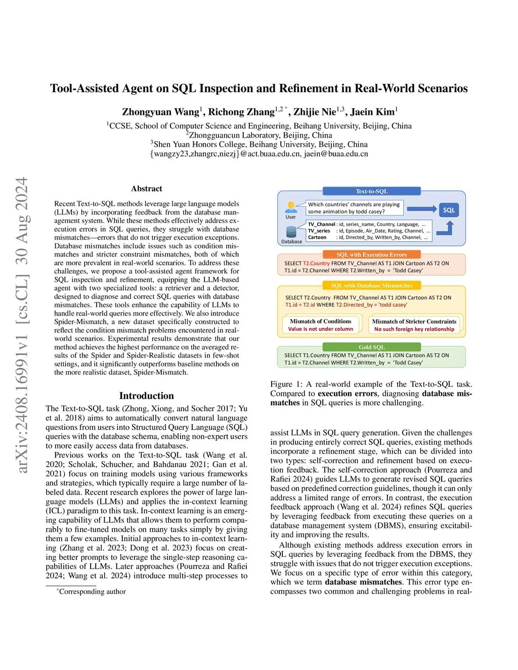 Recent Text-to-SQL methods leverage large language models (LLMs) by incorporating feedback from the database management system. While these methods effectively address execution errors in SQL queries, they struggle with database mismatches -- errors that do not trigger execution exceptions. Database mismatches include issues such as condition mismatches and stricter constraint mismatches, both of which are more prevalent in real-world scenarios. To address these challenges, we propose a tool-assisted agent framework for SQL inspection and refinement, equipping the LLM-based agent with two specialized tools: a retriever and a detector, designed to diagnose and correct SQL queries with database mismatches. These tools enhance the capability of LLMs to handle real-world queries more effectively. We also introduce Spider-Mismatch, a new dataset specifically constructed to reflect the condition mismatch problems encountered in real-world scenarios. Experimental results demonstrate that our method achieves the highest performance on the averaged results of the Spider and Spider-Realistic datasets in few-shot settings, and it significantly outperforms baseline methods on the more realistic dataset, Spider-Mismatch.
