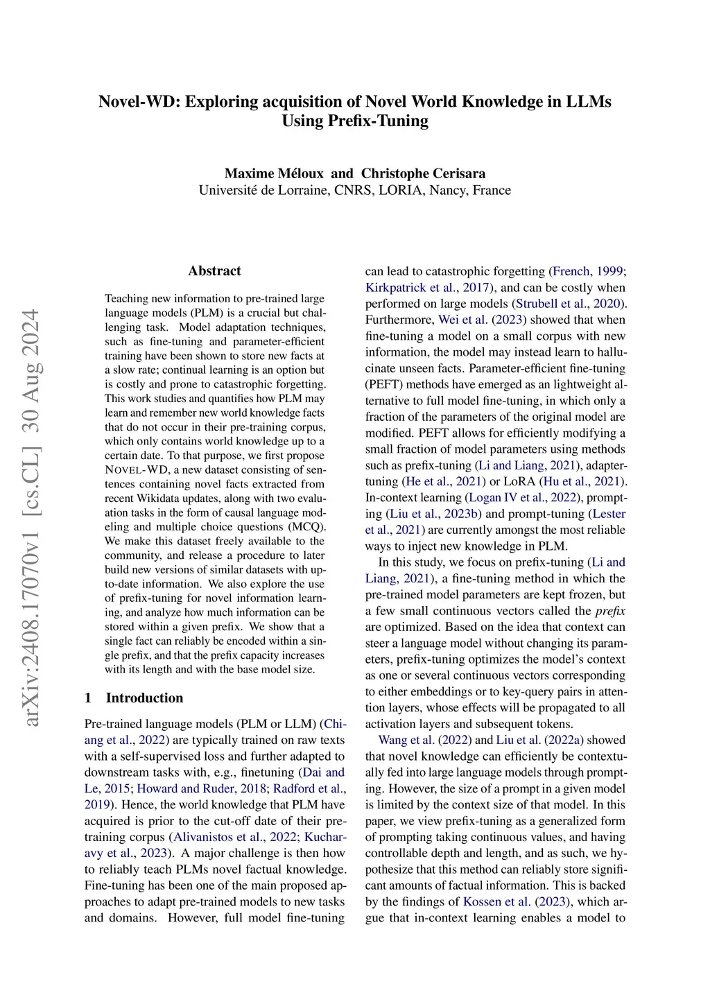 Teaching new information to pre-trained large language models (PLM) is a crucial but challenging task. Model adaptation techniques, such as fine-tuning and parameter-efficient training have been shown to store new facts at a slow rate; continual learning is an option but is costly and prone to catastrophic forgetting. This work studies and quantifies how PLM may learn and remember new world knowledge facts that do not occur in their pre-training corpus, which only contains world knowledge up to a certain date. To that purpose, we first propose Novel-WD, a new dataset consisting of sentences containing novel facts extracted from recent Wikidata updates, along with two evaluation tasks in the form of causal language modeling and multiple choice questions (MCQ). We make this dataset freely available to the community, and release a procedure to later build new versions of similar datasets with up-to-date information. We also explore the use of prefix-tuning for novel information learning, and analyze how much information can be stored within a given prefix. We show that a single fact can reliably be encoded within a single prefix, and that the prefix capacity increases with its length and with the base model size.