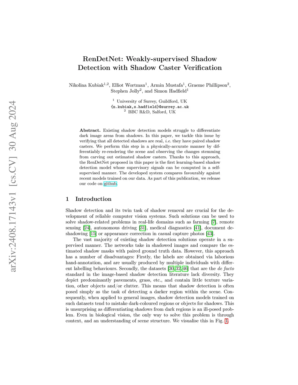 RenDetNet: Weakly-supervised Shadow Detection with Shadow Caster