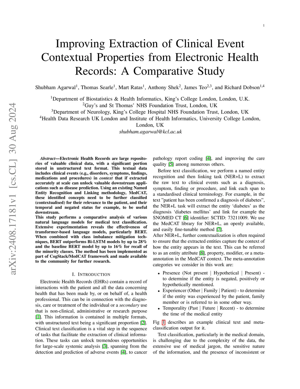 Electronic Health Records are large repositories of valuable clinical data, with a significant portion stored in unstructured text format. This textual data includes clinical events (e.g., disorders, symptoms, findings, medications and procedures) in context that if extracted accurately at scale can unlock valuable downstream applications such as disease prediction. Using an existing Named Entity Recognition and Linking methodology, MedCAT, these identified concepts need to be further classified (contextualised) for their relevance to the patient, and their temporal and negated status for example, to be useful downstream. This study performs a comparative analysis of various natural language models for medical text classification. Extensive experimentation reveals the effectiveness of transformer-based language models, particularly BERT. When combined with class imbalance mitigation techniques, BERT outperforms Bi-LSTM models by up to 28% and the baseline BERT model by up to 16% for recall of the minority classes. The method has been implemented as part of CogStack/MedCAT framework and made available to the community for further research.