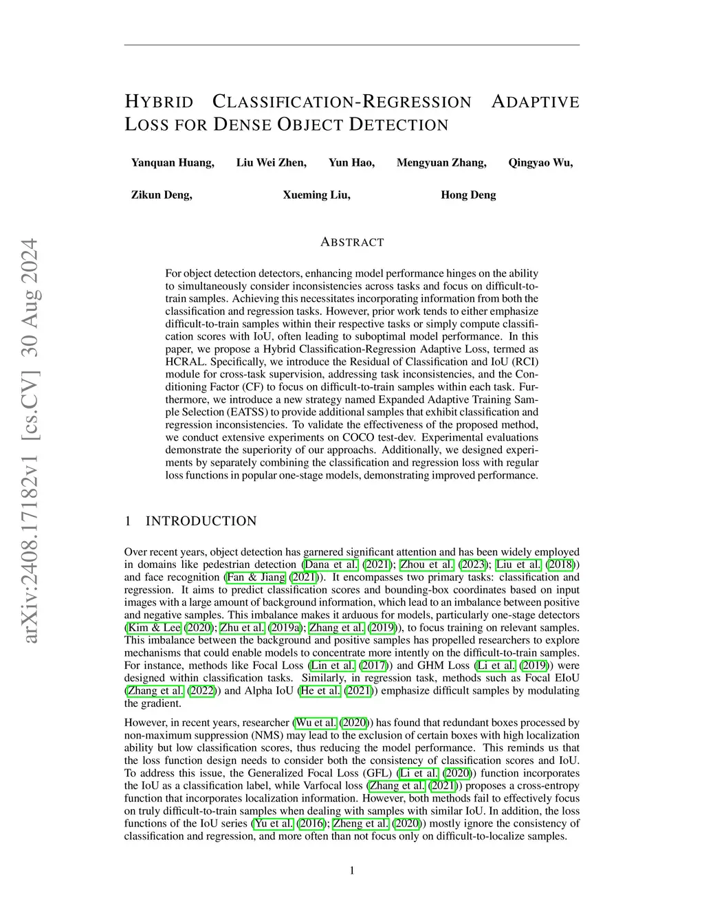 For object detection detectors, enhancing model performance hinges on the ability to simultaneously consider inconsistencies across tasks and focus on difficult-to-train samples. Achieving this necessitates incorporating information from both the classification and regression tasks. However, prior work tends to either emphasize difficult-to-train samples within their respective tasks or simply compute classification scores with IoU, often leading to suboptimal model performance. In this paper, we propose a Hybrid Classification-Regression Adaptive Loss, termed as HCRAL. Specifically, we introduce the Residual of Classification and IoU (RCI) module for cross-task supervision, addressing task inconsistencies, and the Conditioning Factor (CF) to focus on difficult-to-train samples within each task. Furthermore, we introduce a new strategy named Expanded Adaptive Training Sample Selection (EATSS) to provide additional samples that exhibit classification and regression inconsistencies. To validate the effectiveness of the proposed method, we conduct extensive experiments on COCO test-dev. Experimental evaluations demonstrate the superiority of our approachs. Additionally, we designed experiments by separately combining the classification and regression loss with regular loss functions in popular one-stage models, demonstrating improved performance.
