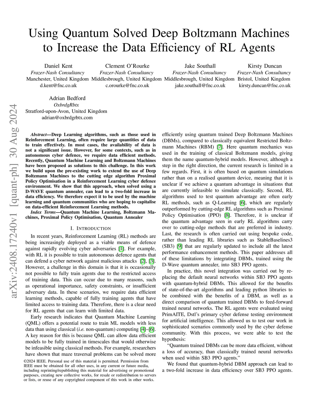 Deep Learning algorithms, such as those used in Reinforcement Learning, often require large quantities of data to train effectively. In most cases, the availability of data is not a significant issue. However, for some contexts, such as in autonomous cyber defence, we require data efficient methods. Recently, Quantum Machine Learning and Boltzmann Machines have been proposed as solutions to this challenge. In this work we build upon the pre-existing work to extend the use of Deep Boltzmann Machines to the cutting edge algorithm Proximal Policy Optimisation in a Reinforcement Learning cyber defence environment. We show that this approach, when solved using a D-WAVE quantum annealer, can lead to a two-fold increase in data efficiency. We therefore expect it to be used by the machine learning and quantum communities who are hoping to capitalise on data-efficient Reinforcement Learning methods.