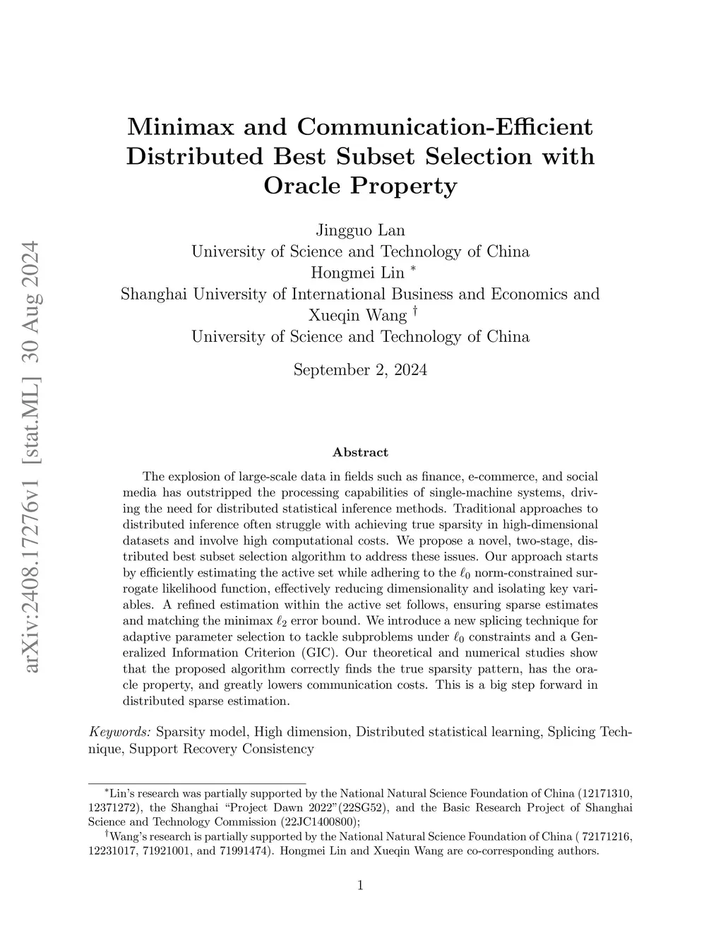 The explosion of large-scale data in fields such as finance, e-commerce, and social media has outstripped the processing capabilities of single-machine systems, driving the need for distributed statistical inference methods. Traditional approaches to distributed inference often struggle with achieving true sparsity in high-dimensional datasets and involve high computational costs. We propose a novel, two-stage, distributed best subset selection algorithm to address these issues. Our approach starts by efficiently estimating the active set while adhering to the norm-constrained surrogate likelihood function, effectively reducing dimensionality and isolating key variables. A refined estimation within the active set follows, ensuring sparse estimates and matching the minimax error bound. We introduce a new splicing technique for adaptive parameter selection to tackle subproblems under constraints and a Generalized Information Criterion (GIC). Our theoretical and numerical studies show that the proposed algorithm correctly finds the true sparsity pattern, has the oracle property, and greatly lowers communication costs. This is a big step forward in distributed sparse estimation.