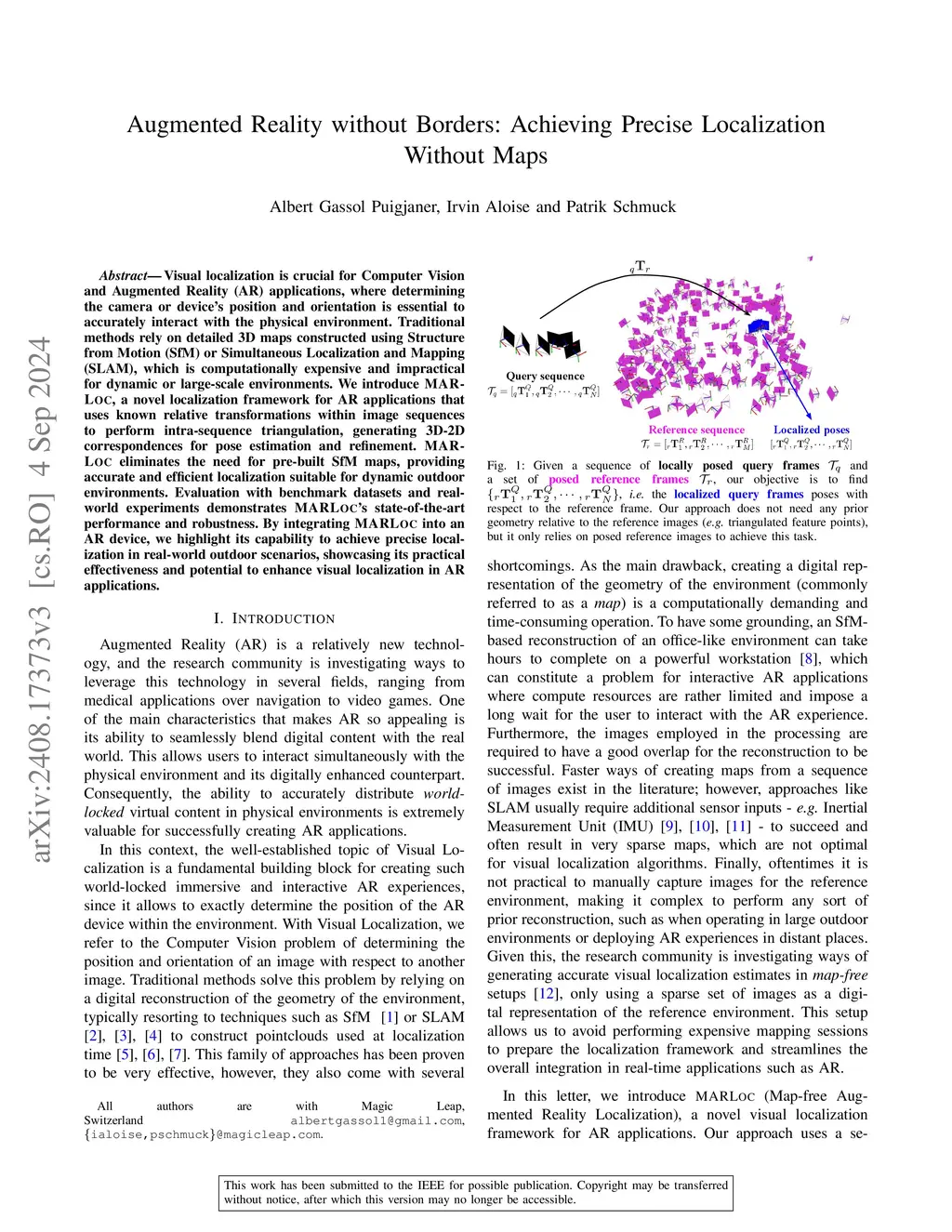Visual localization is crucial for Computer Vision and Augmented Reality (AR) applications, where determining the camera or device's position and orientation is essential to accurately interact with the physical environment. Traditional methods rely on detailed 3D maps constructed using Structure from Motion (SfM) or Simultaneous Localization and Mapping (SLAM), which is computationally expensive and impractical for dynamic or large-scale environments. We introduce MARLoc, a novel localization framework for AR applications that uses known relative transformations within image sequences to perform intra-sequence triangulation, generating 3D-2D correspondences for pose estimation and refinement. MARLoc eliminates the need for pre-built SfM maps, providing accurate and efficient localization suitable for dynamic outdoor environments. Evaluation with benchmark datasets and real-world experiments demonstrates MARLoc's state-of-the-art performance and robustness. By integrating MARLoc into an AR device, we highlight its capability to achieve precise localization in real-world outdoor scenarios, showcasing its practical effectiveness and potential to enhance visual localization in AR applications.