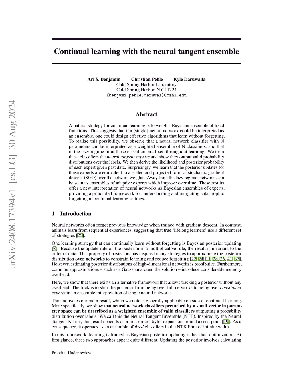 A natural strategy for continual learning is to weigh a Bayesian ensemble of fixed functions. This suggests that if a (single) neural network could be interpreted as an ensemble, one could design effective algorithms that learn without forgetting. To realize this possibility, we observe that a neural network classifier with N parameters can be interpreted as a weighted ensemble of N classifiers, and that in the lazy regime limit these classifiers are fixed throughout learning. We call these classifiers the neural tangent experts and show they output valid probability distributions over the labels. We then derive the likelihood and posterior probability of each expert given past data. Surprisingly, the posterior updates for these experts are equivalent to a scaled and projected form of stochastic gradient descent (SGD) over the network weights. Away from the lazy regime, networks can be seen as ensembles of adaptive experts which improve over time. These results offer a new interpretation of neural networks as Bayesian ensembles of experts, providing a principled framework for understanding and mitigating catastrophic forgetting in continual learning settings.