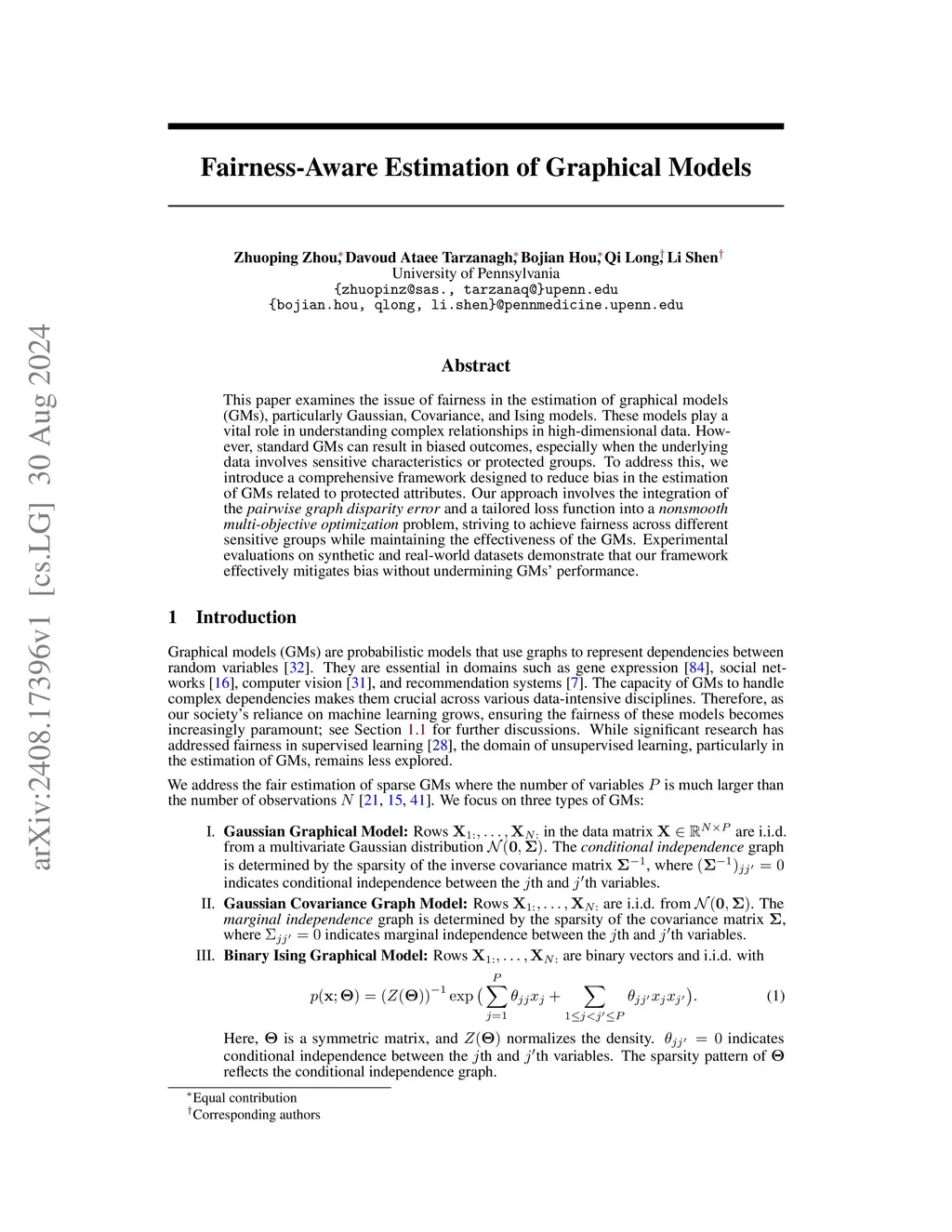 This paper examines the issue of fairness in the estimation of graphical models (GMs), particularly Gaussian, Covariance, and Ising models. These models play a vital role in understanding complex relationships in high-dimensional data. However, standard GMs can result in biased outcomes, especially when the underlying data involves sensitive characteristics or protected groups. To address this, we introduce a comprehensive framework designed to reduce bias in the estimation of GMs related to protected attributes. Our approach involves the integration of the pairwise graph disparity error and a tailored loss function into a nonsmooth multi-objective optimization problem, striving to achieve fairness across different sensitive groups while maintaining the effectiveness of the GMs. Experimental evaluations on synthetic and real-world datasets demonstrate that our framework effectively mitigates bias without undermining GMs' performance.