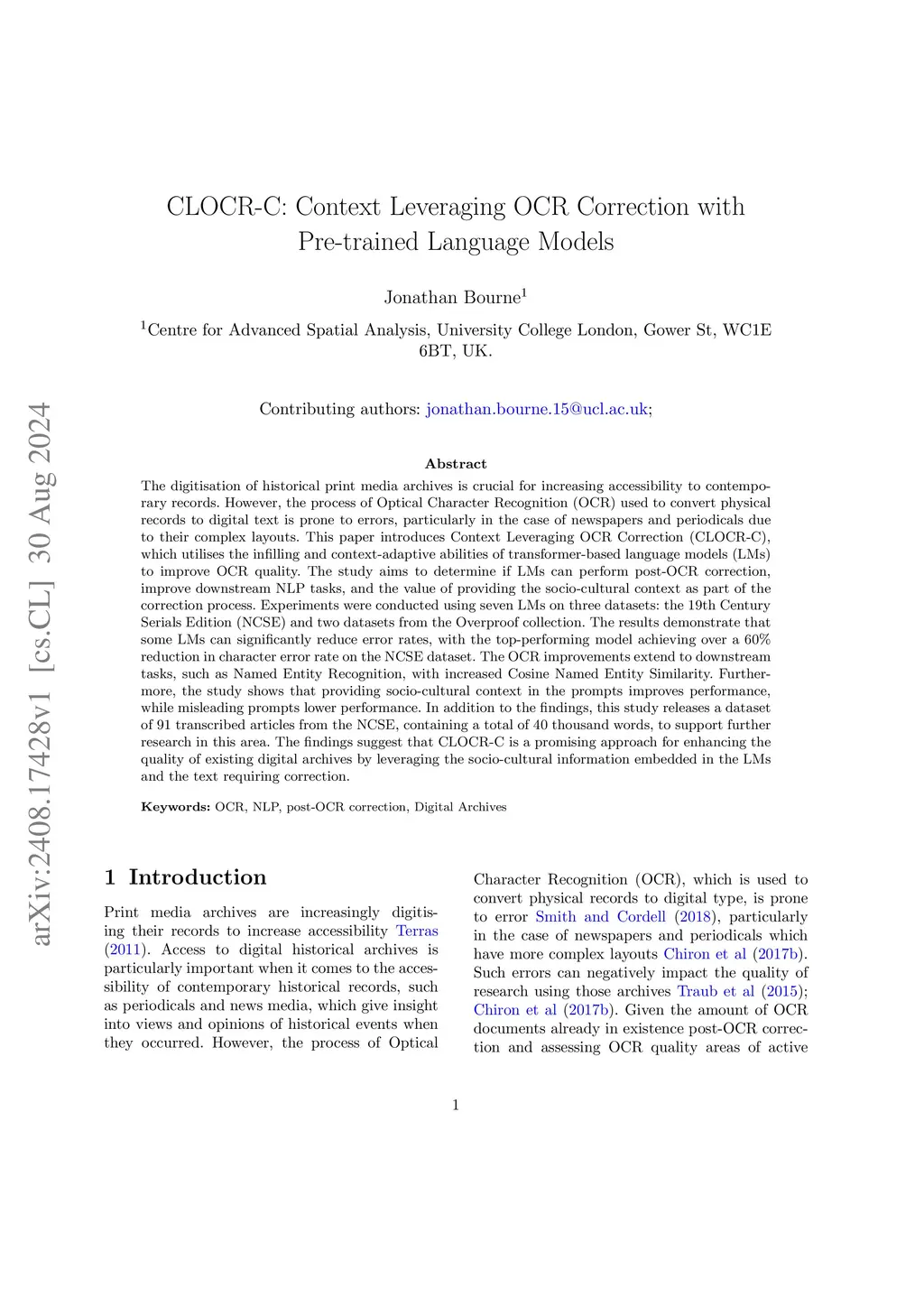CLOCR-C: Context Leveraging OCR Correction with Pre-trained Language Models
