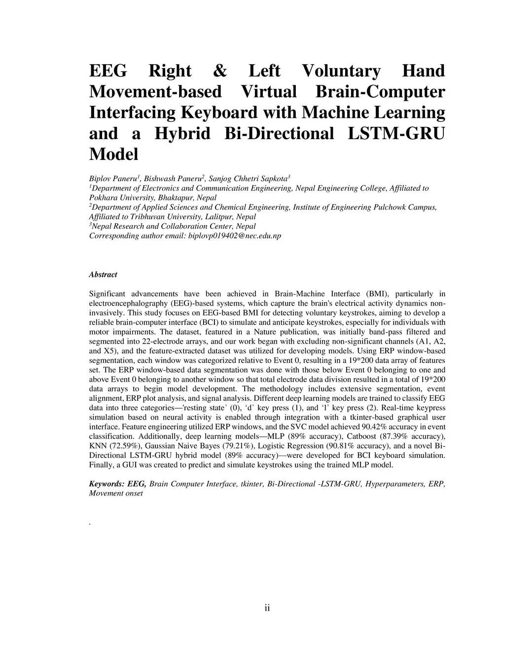 Brain-machine interfaces (BMIs), particularly those based on electroencephalography (EEG), offer promising solutions for assisting individuals with motor disabilities. However, challenges in reliably interpreting EEG signals for specific tasks, such as simulating keystrokes, persist due to the complexity and variability of brain activity. Current EEG-based BMIs face limitations in adaptability, usability, and robustness, especially in applications like virtual keyboards, as traditional machine-learning models struggle to handle high-dimensional EEG data effectively. To address these gaps, we developed an EEG-based BMI system capable of accurately identifying voluntary keystrokes, specifically leveraging right and left voluntary hand movements. Using a publicly available EEG dataset, the signals were pre-processed with band-pass filtering, segmented into 22-electrode arrays, and refined into event-related potential (ERP) windows, resulting in a 19x200 feature array categorized into three classes: resting state (0), 'd' key press (1), and 'l' key press (2). Our approach employs a hybrid neural network architecture with BiGRU-Attention as the proposed model for interpreting EEG signals, achieving superior test accuracy of 90% and a mean accuracy of 91% in 10-fold stratified cross-validation. This performance outperforms traditional ML methods like Support Vector Machines (SVMs) and Naive Bayes, as well as advanced architectures such as Transformers, CNN-Transformer hybrids, and EEGNet. Finally, the BiGRU-Attention model is integrated into a real-time graphical user interface (GUI) to simulate and predict keystrokes from brain activity. Our work demonstrates how deep learning can advance EEG-based BMI systems by addressing the challenges of signal interpretation and classification.