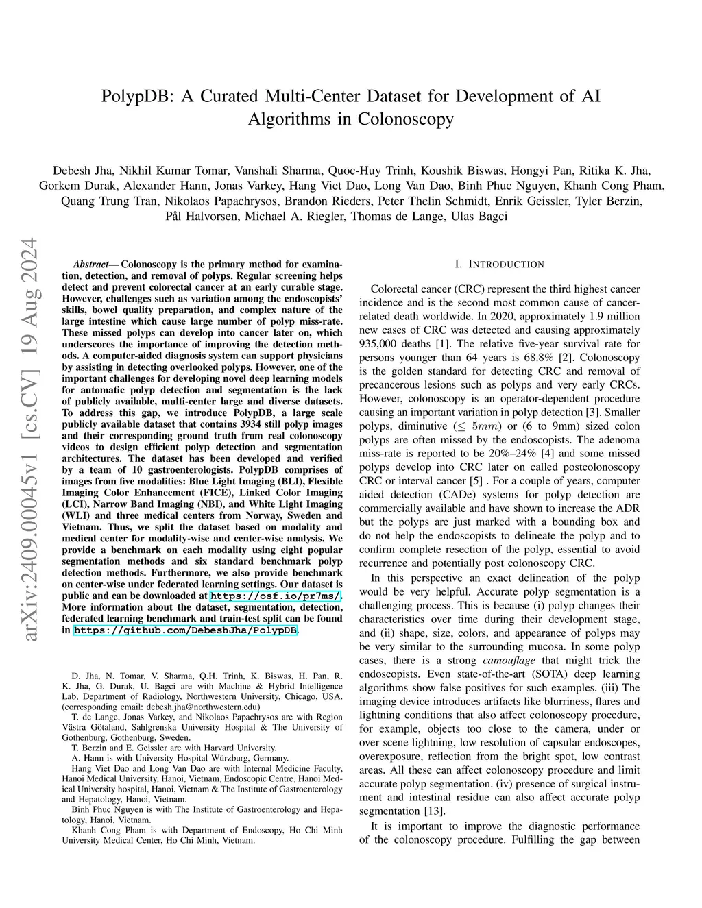 Colonoscopy is the primary method for examination, detection, and removal of polyps. However, challenges such as variations among the endoscopists' skills, bowel quality preparation, and the complex nature of the large intestine contribute to high polyp miss-rate. These missed polyps can develop into cancer later, underscoring the importance of improving the detection methods. To address this gap of lack of publicly available, multi-center large and diverse datasets for developing automatic methods for polyp detection and segmentation, we introduce PolypDB, a large scale publicly available dataset that contains 3934 still polyp images and their corresponding ground truth from real colonoscopy videos. PolypDB comprises images from five modalities: Blue Light Imaging (BLI), Flexible Imaging Color Enhancement (FICE), Linked Color Imaging (LCI), Narrow Band Imaging (NBI), and White Light Imaging (WLI) from three medical centers in Norway, Sweden, and Vietnam. We provide a benchmark on each modality and center, including federated learning settings using popular segmentation and detection benchmarks. PolypDB is public and can be downloaded at \url{this https URL}. More information about the dataset, segmentation, detection, federated learning benchmark and train-test split can be found at \url{this https URL}.