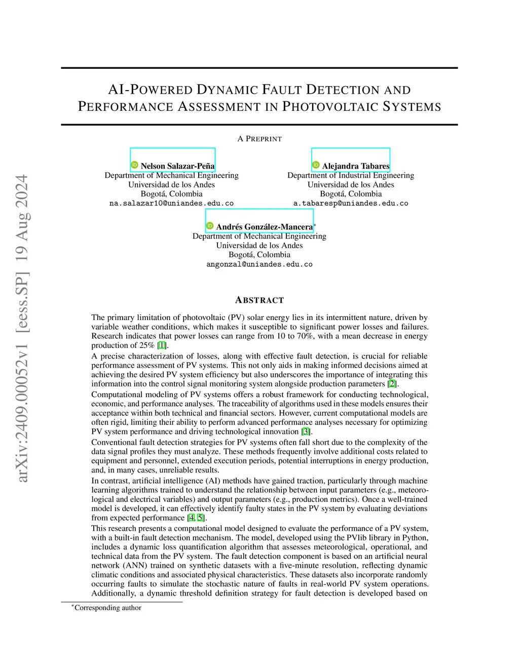 The intermittent nature of photovoltaic (PV) solar energy, driven by variable weather, leads to power losses of 10-70% and an average energy production decrease of 25%. Accurate loss characterization and fault detection are crucial for reliable PV system performance and efficiency, integrating this data into control signal monitoring systems. Computational modeling of PV systems supports technological, economic, and performance analyses, but current models are often rigid, limiting advanced performance optimization and innovation. Conventional fault detection strategies are costly and often yield unreliable results due to complex data signal profiles. Artificial intelligence (AI), especially machine learning algorithms, offers improved fault detection by analyzing relationships between input parameters (e.g., meteorological and electrical) and output metrics (e.g., production). Once trained, these models can effectively identify faults by detecting deviations from expected performance. This research presents a computational model using the PVlib library in Python, incorporating a dynamic loss quantification algorithm that processes meteorological, operational, and technical data. An artificial neural network (ANN) trained on synthetic datasets with a five-minute resolution simulates real-world PV system faults. A dynamic threshold definition for fault detection is based on historical data from a PV system at Universidad de los Andes. Key contributions include: (i) a PV system model with a mean absolute error of 6.0% in daily energy estimation; (ii) dynamic loss quantification without specialized equipment; (iii) an AI-based algorithm for technical parameter estimation, avoiding special monitoring devices; and (iv) a fault detection model achieving 82.2% mean accuracy and 92.6% maximum accuracy.