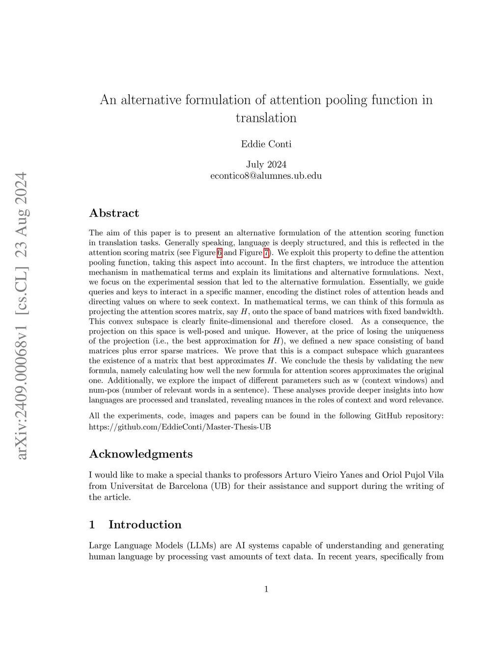The aim of this paper is to present an alternative formulation of the attention scoring function in translation tasks. Generally speaking, language is deeply structured, and this is reflected in the attention scoring matrix. We exploit this property to define the attention pooling function, taking this aspect into account. In the first chapters, we introduce the attention mechanism in mathematical terms and explain its limitations and alternative formulations. Next, we focus on the experimental session that led to the alternative formulation. Essentially, we guide queries and keys to interact in a specific manner, encoding the distinct roles of attention heads and directing values on where to seek context. In mathematical terms, we can think of this formula as projecting the attention scores matrix, say , onto the space of band matrices with fixed bandwidth. This convex subspace is clearly finite-dimensional and therefore closed. As a consequence, the projection on this space is well-posed and unique. However, at the price of losing the uniqueness of the projection (i.e., the best approximation for ), we defined a new space consisting of band matrices plus error sparse matrices. We prove that this is a compact subspace which guarantees the existence of a matrix that best approximates . We conclude the thesis by validating the new formula, namely calculating how well the new formula for attention scores approximates the original one. Additionally, we explore the impact of different parameters such as w (context windows) and num-pos (number of relevant words in a sentence). These analyses provide deeper insights into how languages are processed and translated, revealing nuances in the roles of context and word relevance.