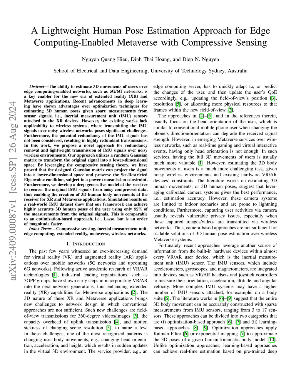 The ability to estimate 3D movements of users over edge computing-enabled networks, such as 5G/6G networks, is a key enabler for the new era of extended reality (XR) and Metaverse applications. Recent advancements in deep learning have shown advantages over optimization techniques for estimating 3D human poses given spare measurements from sensor signals, i.e., inertial measurement unit (IMU) sensors attached to the XR devices. However, the existing works lack applicability to wireless systems, where transmitting the IMU signals over noisy wireless networks poses significant challenges. Furthermore, the potential redundancy of the IMU signals has not been considered, resulting in highly redundant transmissions. In this work, we propose a novel approach for redundancy removal and lightweight transmission of IMU signals over noisy wireless environments. Our approach utilizes a random Gaussian matrix to transform the original signal into a lower-dimensional space. By leveraging the compressive sensing theory, we have proved that the designed Gaussian matrix can project the signal into a lower-dimensional space and preserve the Set-Restricted Eigenvalue condition, subject to a power transmission constraint. Furthermore, we develop a deep generative model at the receiver to recover the original IMU signals from noisy compressed data, thus enabling the creation of 3D human body movements at the receiver for XR and Metaverse applications. Simulation results on a real-world IMU dataset show that our framework can achieve highly accurate 3D human poses of the user using only of the measurements from the original signals. This is comparable to an optimization-based approach, i.e., Lasso, but is an order of magnitude faster.
