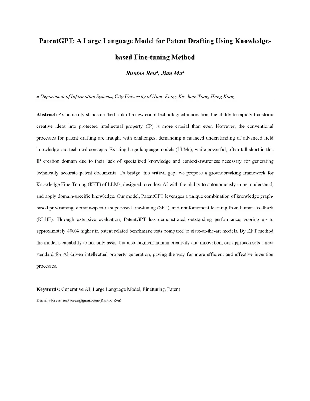 In traditional innovation practices, concept and IP generation are often iteratively integrated. Both processes demand an intricate understanding of advanced technical domain knowledge. Existing large language models (LLMs), while possessing massive pre-trained knowledge, often fall short in the innovative concept generation due to a lack of specialized knowledge necessary for the generation. To bridge this critical gap, we propose a novel knowledge finetuning (KFT) framework to endow LLM-based AI with the ability to autonomously mine, understand, and apply domain-specific knowledge and concepts for invention generation, i.e., concept and patent generation together. Our proposed PatentGPT integrates knowledge injection pre-training (KPT), domain-specific supervised finetuning (SFT), and reinforcement learning from human feedback (RLHF). Extensive evaluation shows that PatentGPT significantly outperforms the state-of-the-art models on patent-related benchmark tests. Our method not only provides new insights into data-driven innovation but also paves a new path to fine-tune LLMs for applications in the context of technology. We also discuss the managerial and policy implications of AI-generating inventions in the future.