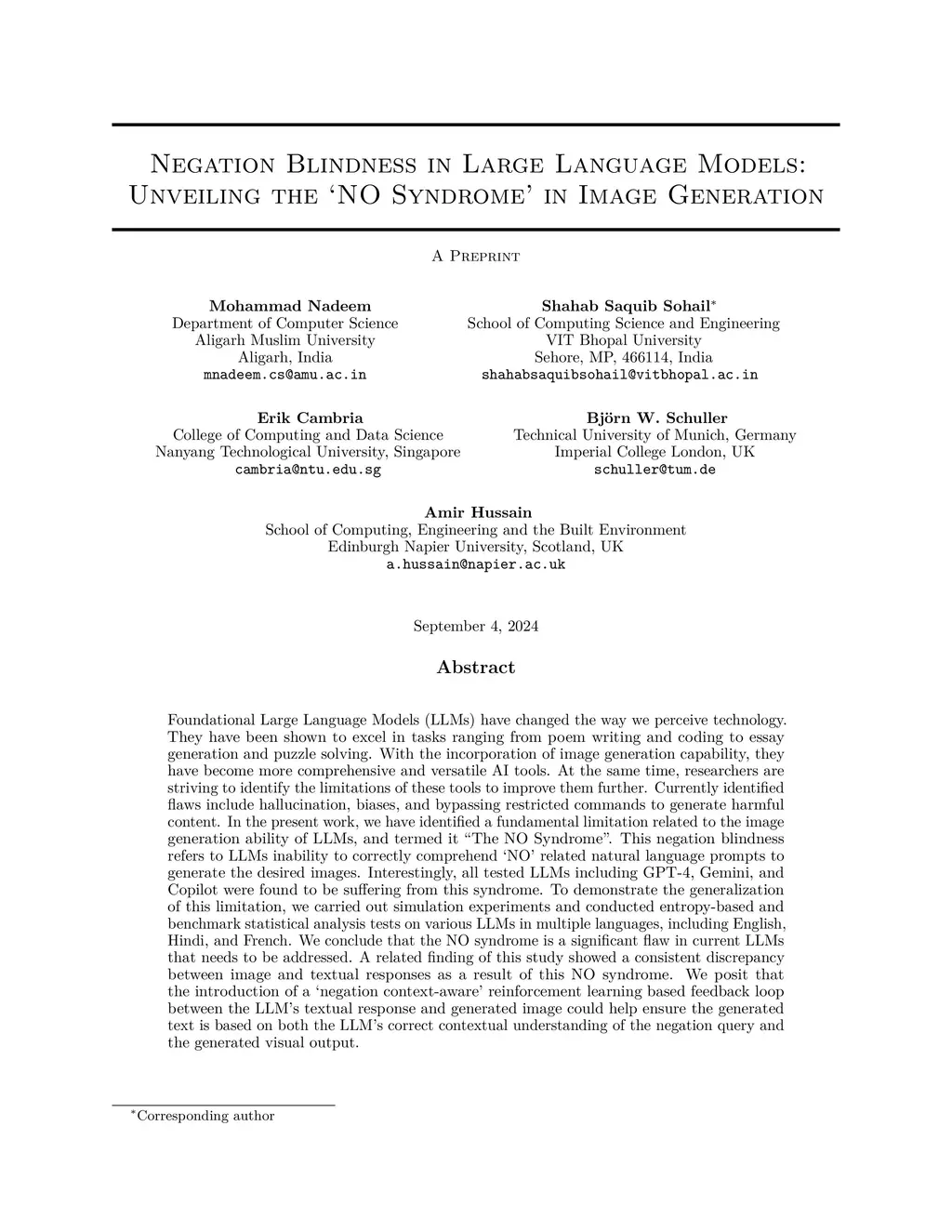 Foundational Large Language Models (LLMs) have changed the way we perceive technology. They have been shown to excel in tasks ranging from poem writing and coding to essay generation and puzzle solving. With the incorporation of image generation capability, they have become more comprehensive and versatile AI tools. At the same time, researchers are striving to identify the limitations of these tools to improve them further. Currently identified flaws include hallucination, biases, and bypassing restricted commands to generate harmful content. In the present work, we have identified a fundamental limitation related to the image generation ability of LLMs, and termed it The NO Syndrome. This negation blindness refers to LLMs inability to correctly comprehend NO related natural language prompts to generate the desired images. Interestingly, all tested LLMs including GPT-4, Gemini, and Copilot were found to be suffering from this syndrome. To demonstrate the generalization of this limitation, we carried out simulation experiments and conducted entropy-based and benchmark statistical analysis tests on various LLMs in multiple languages, including English, Hindi, and French. We conclude that the NO syndrome is a significant flaw in current LLMs that needs to be addressed. A related finding of this study showed a consistent discrepancy between image and textual responses as a result of this NO syndrome. We posit that the introduction of a negation context-aware reinforcement learning based feedback loop between the LLMs textual response and generated image could help ensure the generated text is based on both the LLMs correct contextual understanding of the negation query and the generated visual output.