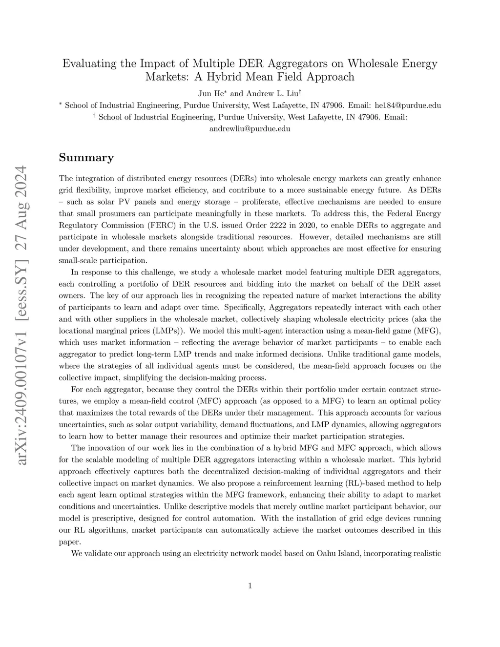 The integration of distributed energy resources (DERs) into wholesale energy markets can greatly enhance grid flexibility, improve market efficiency, and contribute to a more sustainable energy future. As DERs -- such as solar PV panels and energy storage -- proliferate, effective mechanisms are needed to ensure that small prosumers can participate meaningfully in these markets. We study a wholesale market model featuring multiple DER aggregators, each controlling a portfolio of DER resources and bidding into the market on behalf of the DER asset owners. The key of our approach lies in recognizing the repeated nature of market interactions the ability of participants to learn and adapt over time. Specifically, Aggregators repeatedly interact with each other and with other suppliers in the wholesale market, collectively shaping wholesale electricity prices (aka the locational marginal prices (LMPs)). We model this multi-agent interaction using a mean-field game (MFG), which uses market information -- reflecting the average behavior of market participants -- to enable each aggregator to predict long-term LMP trends and make informed decisions. For each aggregator, because they control the DERs within their portfolio under certain contract structures, we employ a mean-field control (MFC) approach (as opposed to a MFG) to learn an optimal policy that maximizes the total rewards of the DERs under their management. We also propose a reinforcement learning (RL)-based method to help each agent learn optimal strategies within the MFG framework, enhancing their ability to adapt to market conditions and uncertainties. Numerical simulations show that LMPs quickly reach a steady state in the hybrid mean-field approach. Furthermore, our results demonstrate that the combination of energy storage and mean-field learning significantly reduces price volatility compared to scenarios without storage.