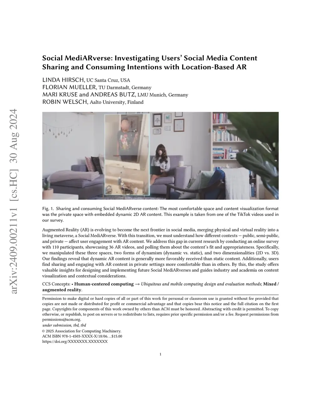 Augmented Reality (AR) is evolving to become the next frontier in social media, merging physical and virtual reality into a living metaverse, a Social MediARverse. With this transition, we must understand how different contexts (public, semi-public, and private) affect user engagement with AR content. We address this gap in current research by conducting an online survey with 110 participants, showcasing 36 AR videos, and polling them about the content's fit and appropriateness. Specifically, we manipulated these three spaces, two forms of dynamism (dynamic vs. static), and two dimensionalities (2D vs. 3D). Our findings reveal that dynamic AR content is generally more favorably received than static content. Additionally, users find sharing and engaging with AR content in private settings more comfortable than in others. By this, the study offers valuable insights for designing and implementing future Social MediARverses and guides industry and academia on content visualization and contextual considerations.