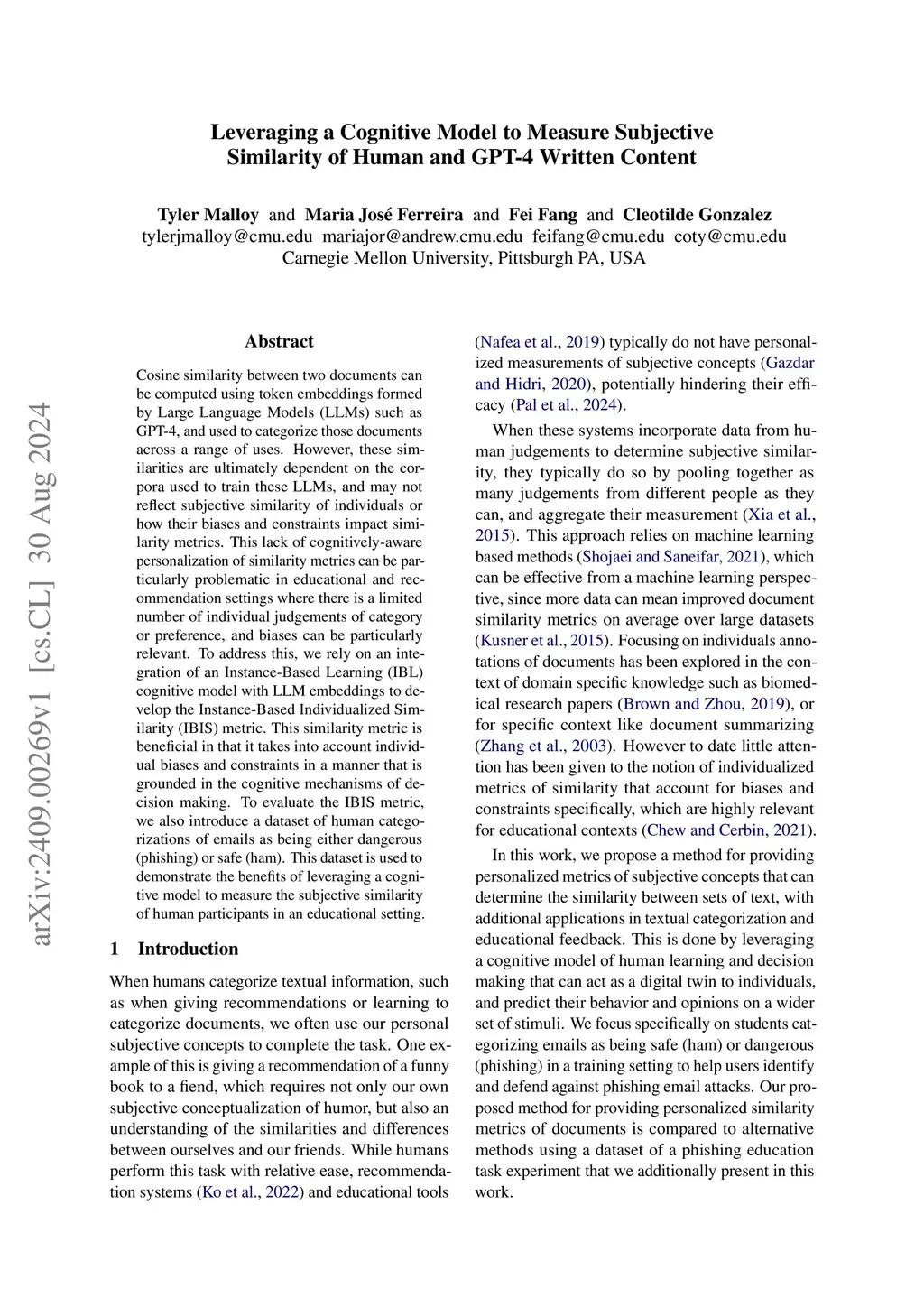 Cosine similarity between two documents can be computed using token embeddings formed by Large Language Models (LLMs) such as GPT-4, and used to categorize those documents across a range of uses. However, these similarities are ultimately dependent on the corpora used to train these LLMs, and may not reflect subjective similarity of individuals or how their biases and constraints impact similarity metrics. This lack of cognitively-aware personalization of similarity metrics can be particularly problematic in educational and recommendation settings where there is a limited number of individual judgements of category or preference, and biases can be particularly relevant. To address this, we rely on an integration of an Instance-Based Learning (IBL) cognitive model with LLM embeddings to develop the Instance-Based Individualized Similarity (IBIS) metric. This similarity metric is beneficial in that it takes into account individual biases and constraints in a manner that is grounded in the cognitive mechanisms of decision making. To evaluate the IBIS metric, we also introduce a dataset of human categorizations of emails as being either dangerous (phishing) or safe (ham). This dataset is used to demonstrate the benefits of leveraging a cognitive model to measure the subjective similarity of human participants in an educational setting.
