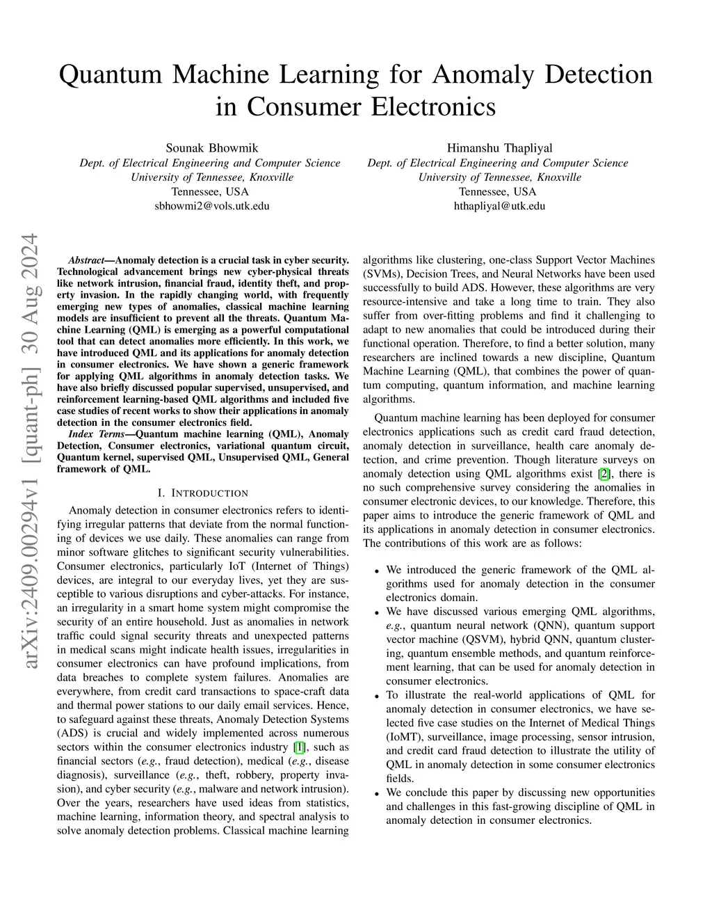 Anomaly detection is a crucial task in cyber security. Technological advancement brings new cyber-physical threats like network intrusion, financial fraud, identity theft, and property invasion. In the rapidly changing world, with frequently emerging new types of anomalies, classical machine learning models are insufficient to prevent all the threats. Quantum Machine Learning (QML) is emerging as a powerful computational tool that can detect anomalies more efficiently. In this work, we have introduced QML and its applications for anomaly detection in consumer electronics. We have shown a generic framework for applying QML algorithms in anomaly detection tasks. We have also briefly discussed popular supervised, unsupervised, and reinforcement learning-based QML algorithms and included five case studies of recent works to show their applications in anomaly detection in the consumer electronics field.